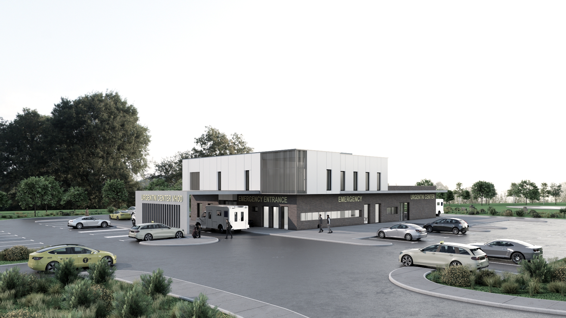 keep the pavement the same in concrete clouds in the sky lots of greenery and trees preserve all existing text on signs and surfaces grey reflections in the windows bright entrance audi a 6 and marcedes on the parking