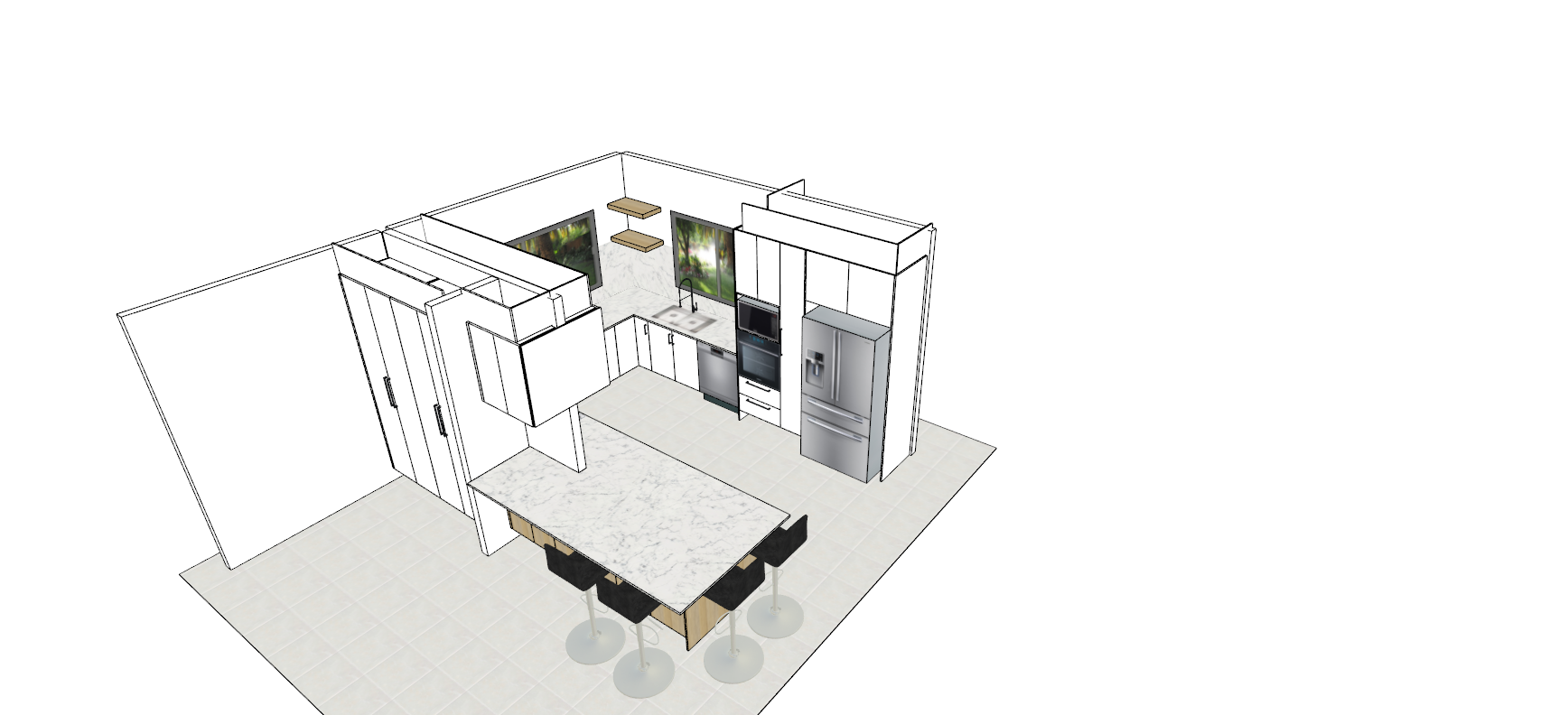 flat white panels with natural oak woodgrain panels on island have some sunlight coming in from the left hand side floors to be light coloured pine floorboards