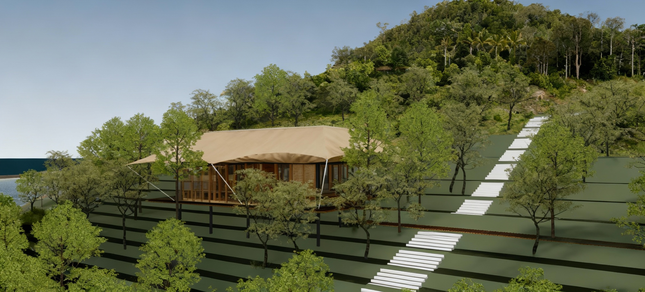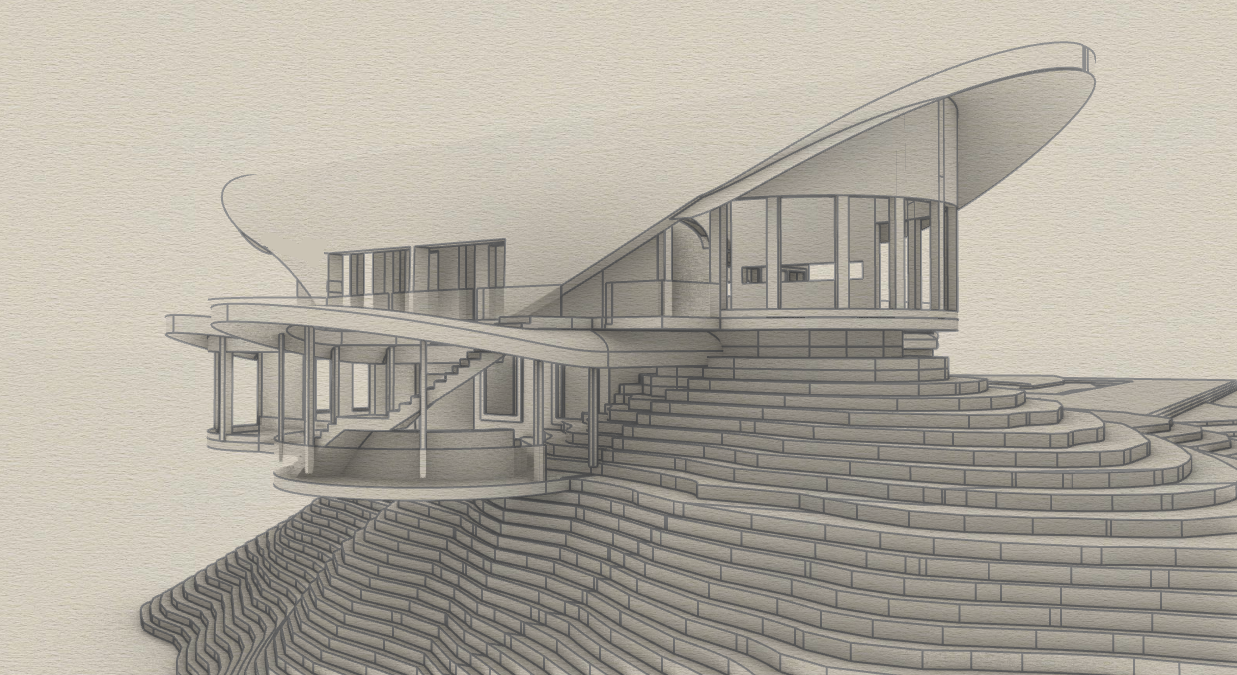 architectural watercolor rendering of the exact building geometry shown in mnt data 5f423b97 5134 4fe8 86e3 d5c6bf756524 png do not alter or reinterpret any structure curves roofs decks windows supports or proportions depict the two story research facility perched on a steep natural mountainside replace the blocky stepped terrain with realistic rocky slopes blended with dense forest vegetation add trees shrubs and natural greenery behind and around the building to integrate it into a forested high elevation environment the main roof must be black corrugated metal with clear ribbed texture the curved cantilevered deck roof must also be solid black metal all exterior walls must be matte gray metal panels with visible seams all windows must be black steel framed ensure these colors and materials are strong and unambiguous background includes distant hazy blue mountain ranges cloudy bright blue skies and fog pooling near the base of the cliffs to emphasize elevation render in a soft architectural watercolor style with pencil and ink linework subtle shadows natural atmospheric washes and gentle fading into white paper edges while keeping all building geometry exactly as modeled