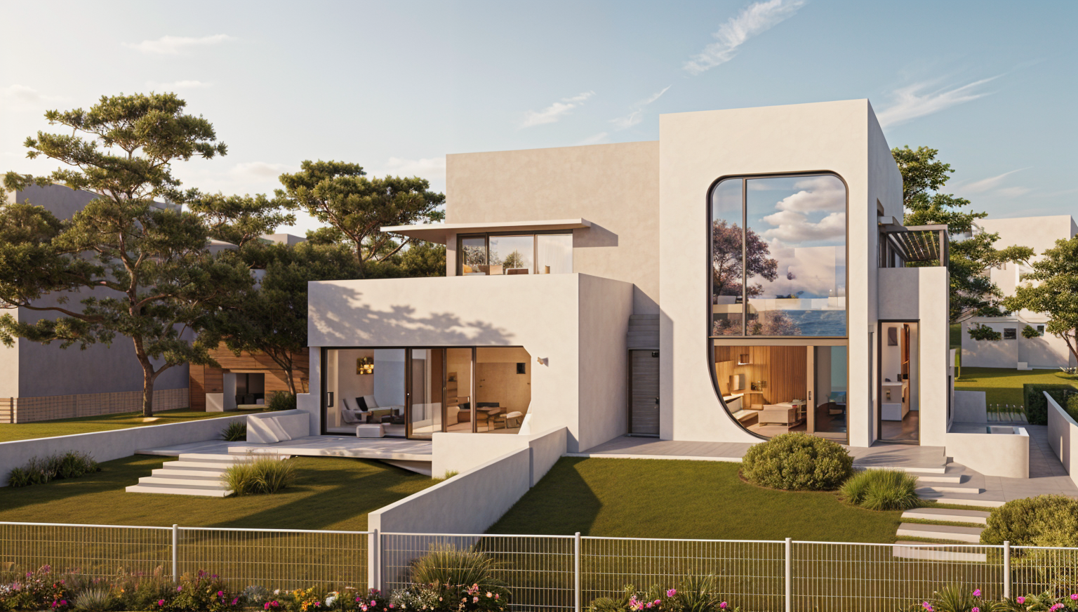 minimalism exterior shot urban background with homes lot of vegetation sunny day with beautyful redish yelowish clouds nice windows reflexion modern front modular fence nice textures hiper realistic cinematic view architecture