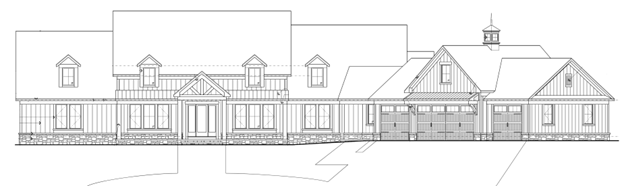 exterior shot make the siding and trim all white make standing seam metal roof black and the rest of the roof black asphalt shingles make the windows and doors black make the garage doors black the lines below represent edge of concrete pavement keep the house exactly as shown with the garages and side porch at a 45 degree angle from the left portion of the house architecture