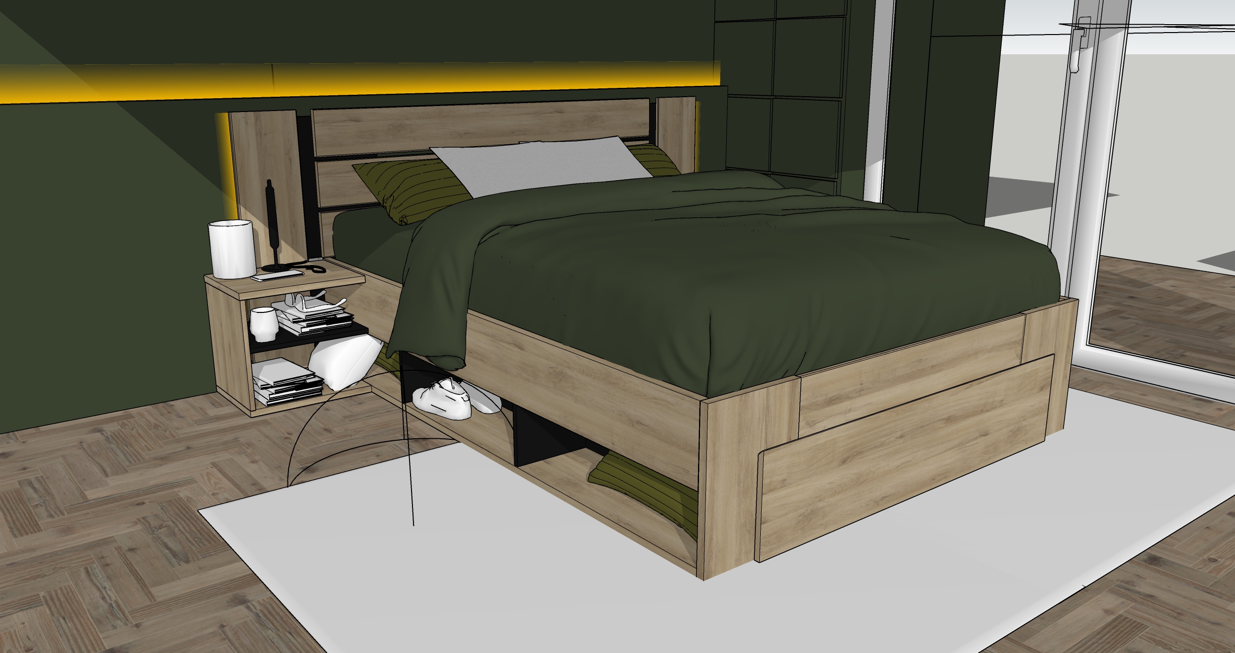 chambre moderne et chaleureuse au design naturel grand lit avec drap beige couvertures vert fonc et coussins assortis mur d coratif vert textur plantes tombantes fix es en hauteur suspensions avec ampoules vintage en verre sol en bois clair grand tapis gris eclairage led doux sur les montant vertical de la tete de lit ambiance cosy style contemporain et minimaliste clairage doux et r aliste rendu photo r aliste haute r solution