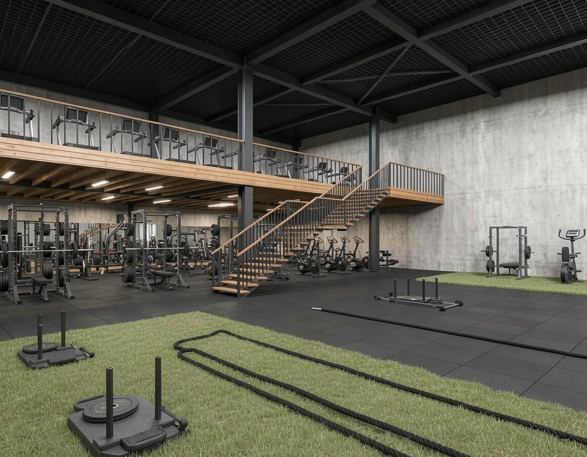 edit the existing gym render as is add suspended gym style led feature lighting in geometric hexagonal shapes hanging from the ceiling grid on thin cables the lights should be clean modern and evenly spaced creating a bold architectural feature while casting soft realistic illumination below keep the lighting subtle and integrated enhancing depth without overpowering the existing scene keep everything else exactly as it appears in the base render no people cinematic architectural visualization
