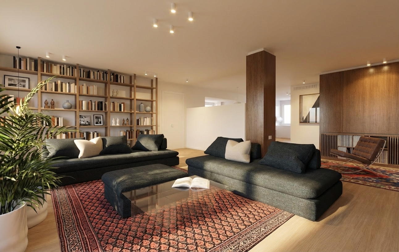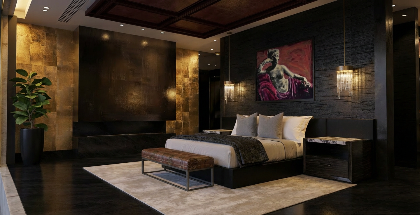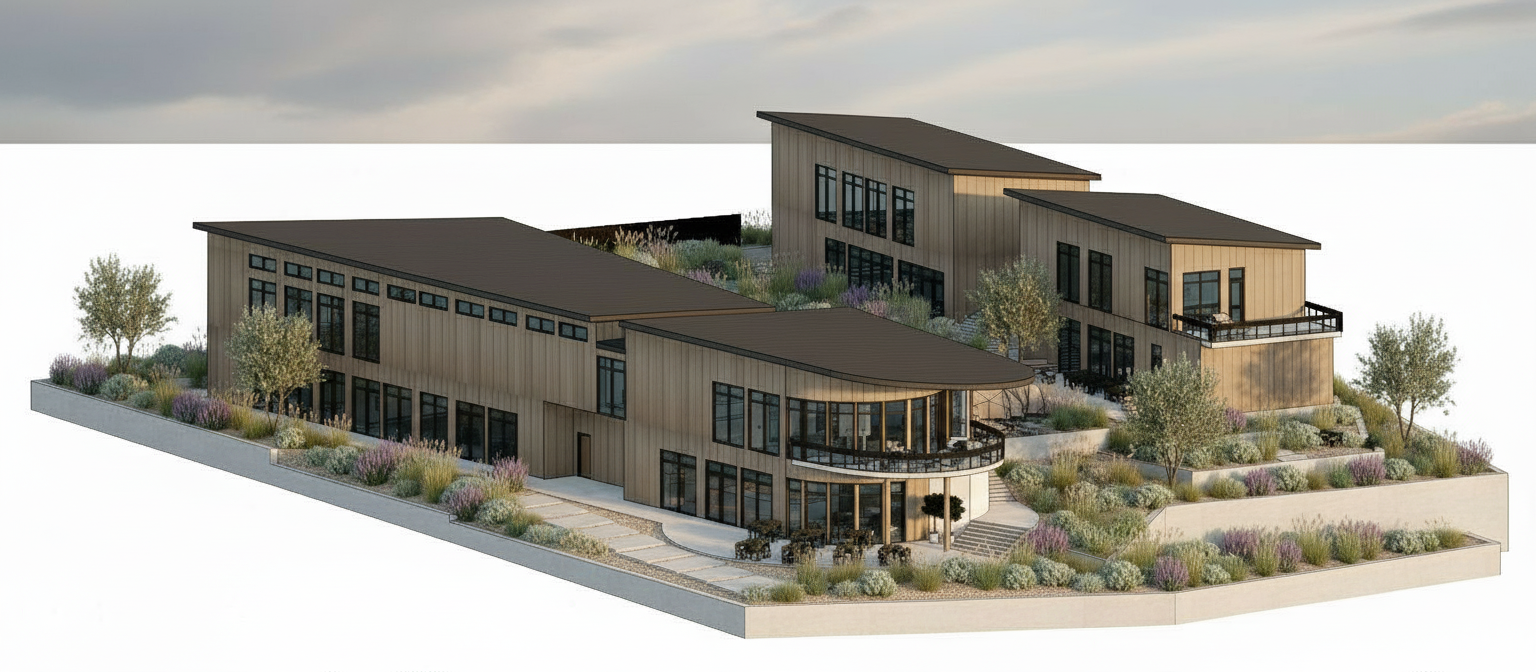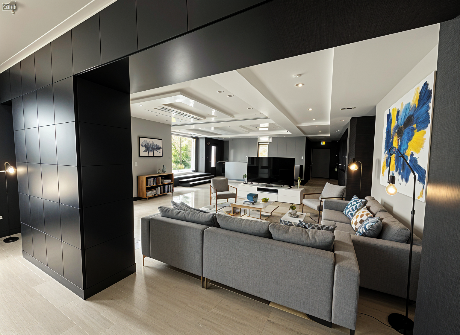 front elevation set in a midwest spring environment with green and white flowers black windows black gutters black soffit black fascia black roof james hardie midnight black siding black brick with grey mortar provia chisel cut brindle manufactured stone stone special walnut stained cedar on the front porch post and porch header black raised panel garage door black front door