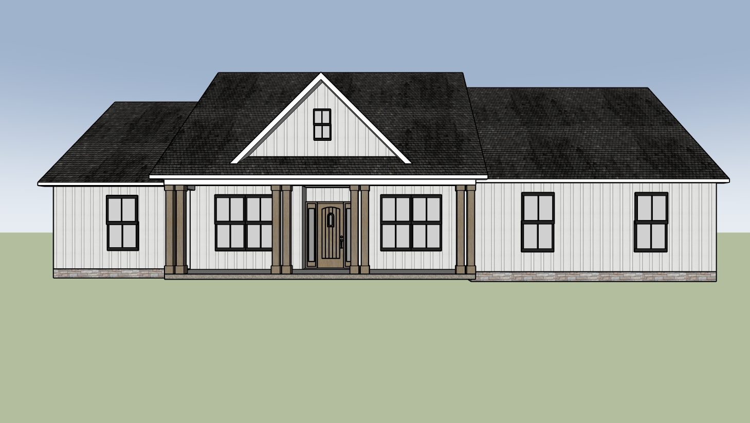 a manicured lawn layered flower beds low maintenance shrubs native plants concrete sidewalk from right side garage to front door driveway enters on right side show mature in the background with the appalachian mountains show clouds in the sky