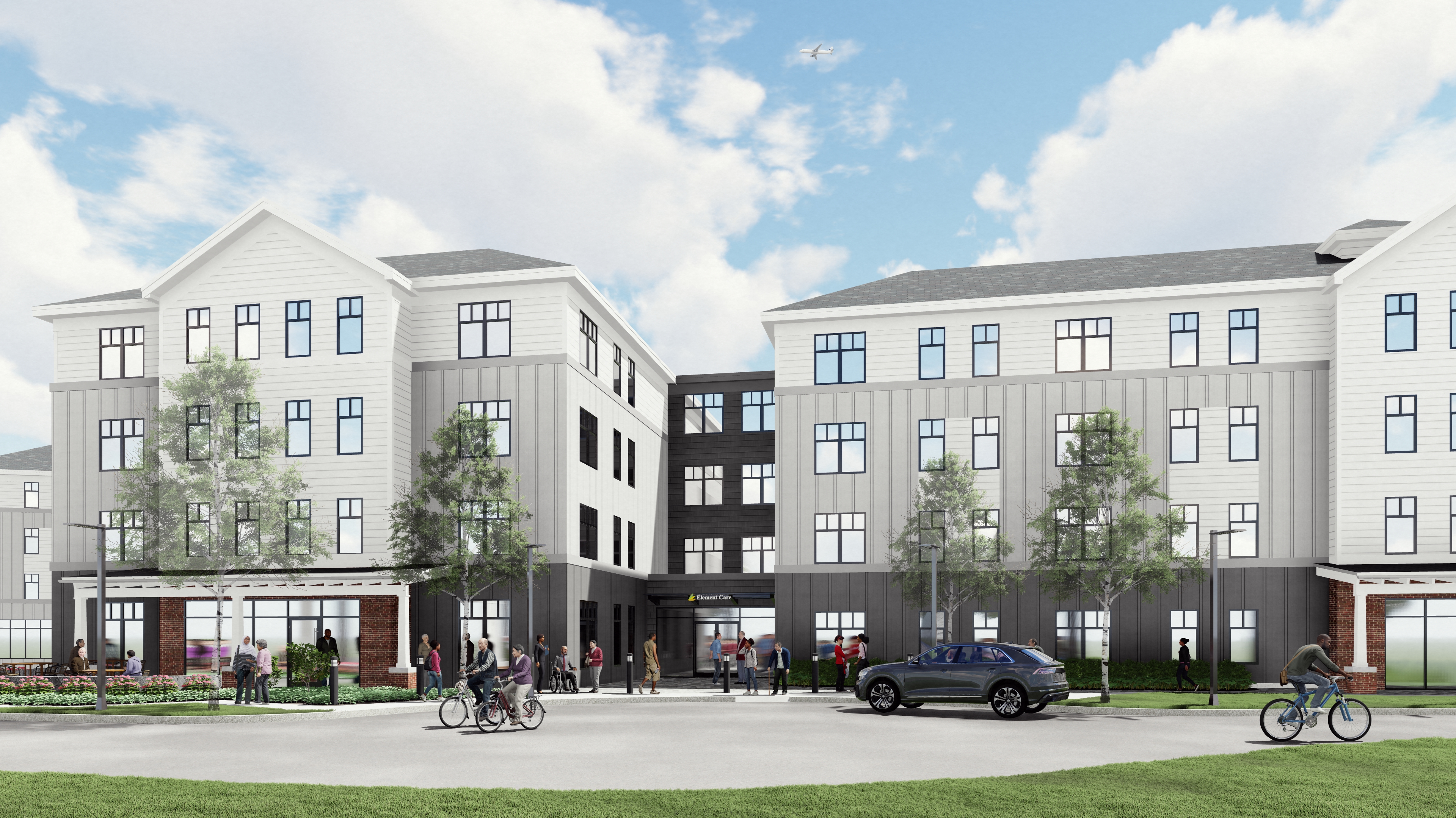 a manicured lawn layered low maintenance shrubs native plants trees in locations shown in image paved are for driving show a few old people walking no bikes