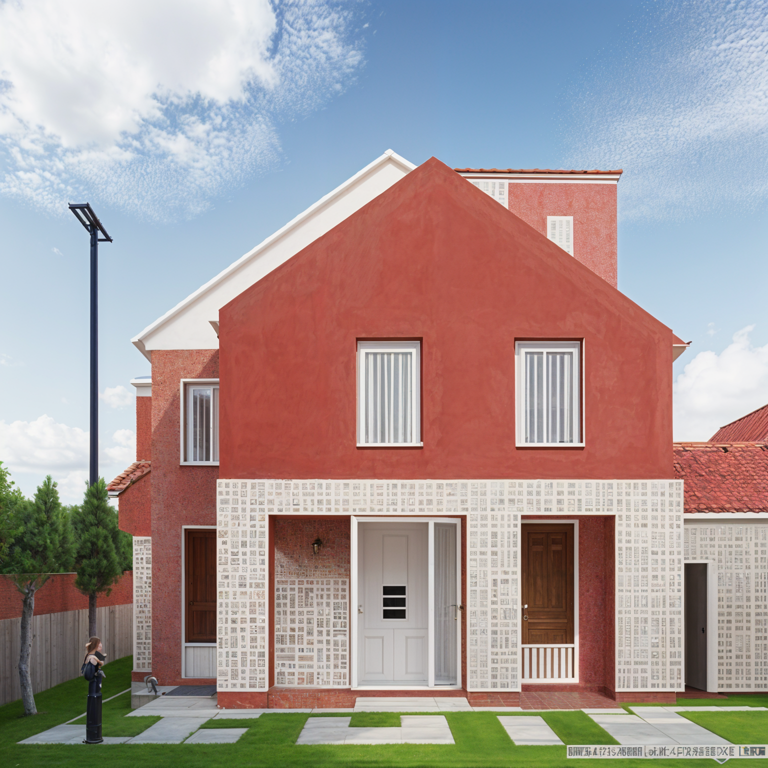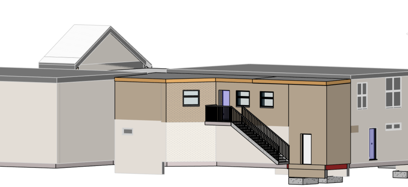 create a visual with light brown wash brick work on building and clear blue skies with green grass as landscaping around the building