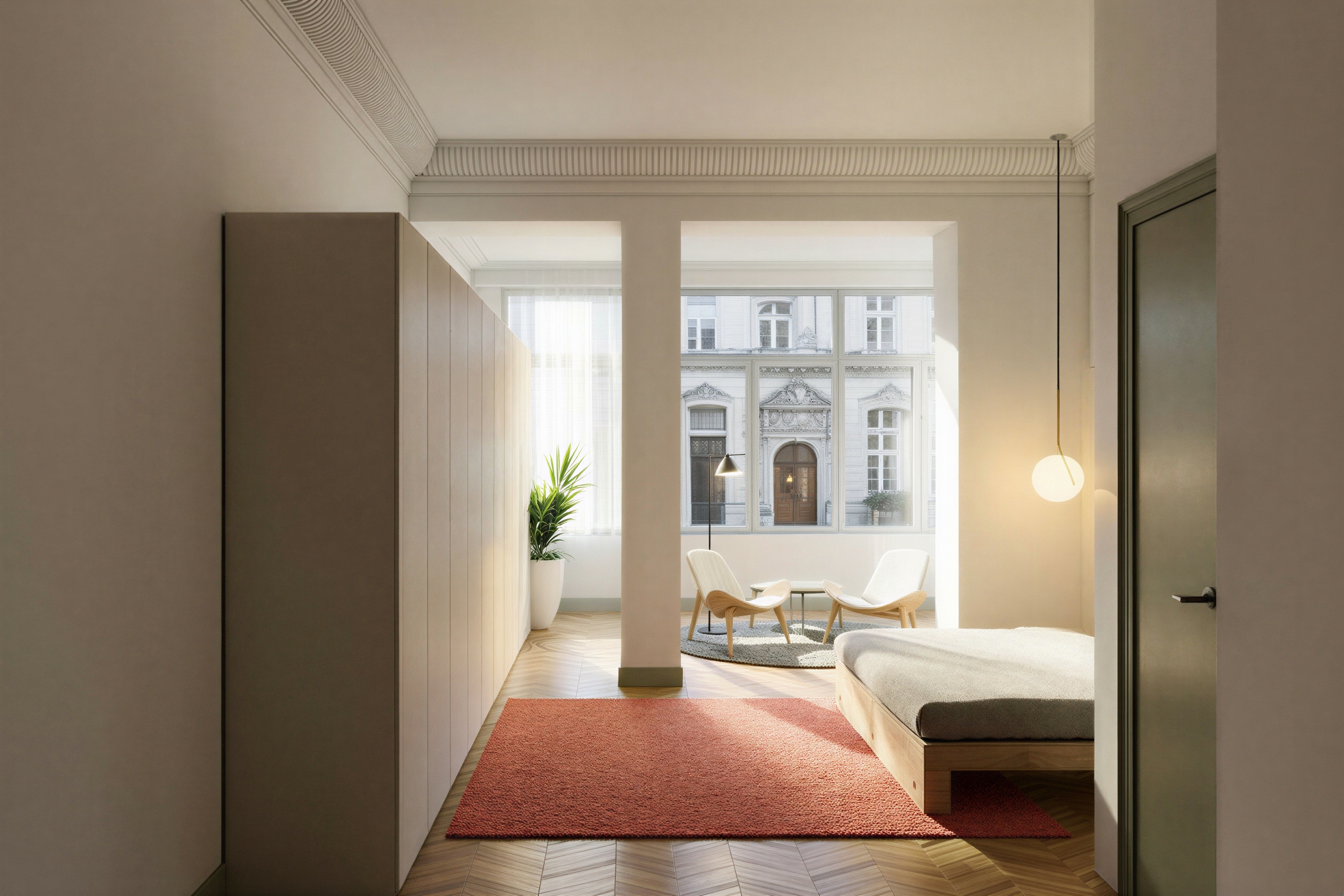 increase natural light in the foreground change direction of sunlight 90 building in the background should have an anonymous generic facade without ornament