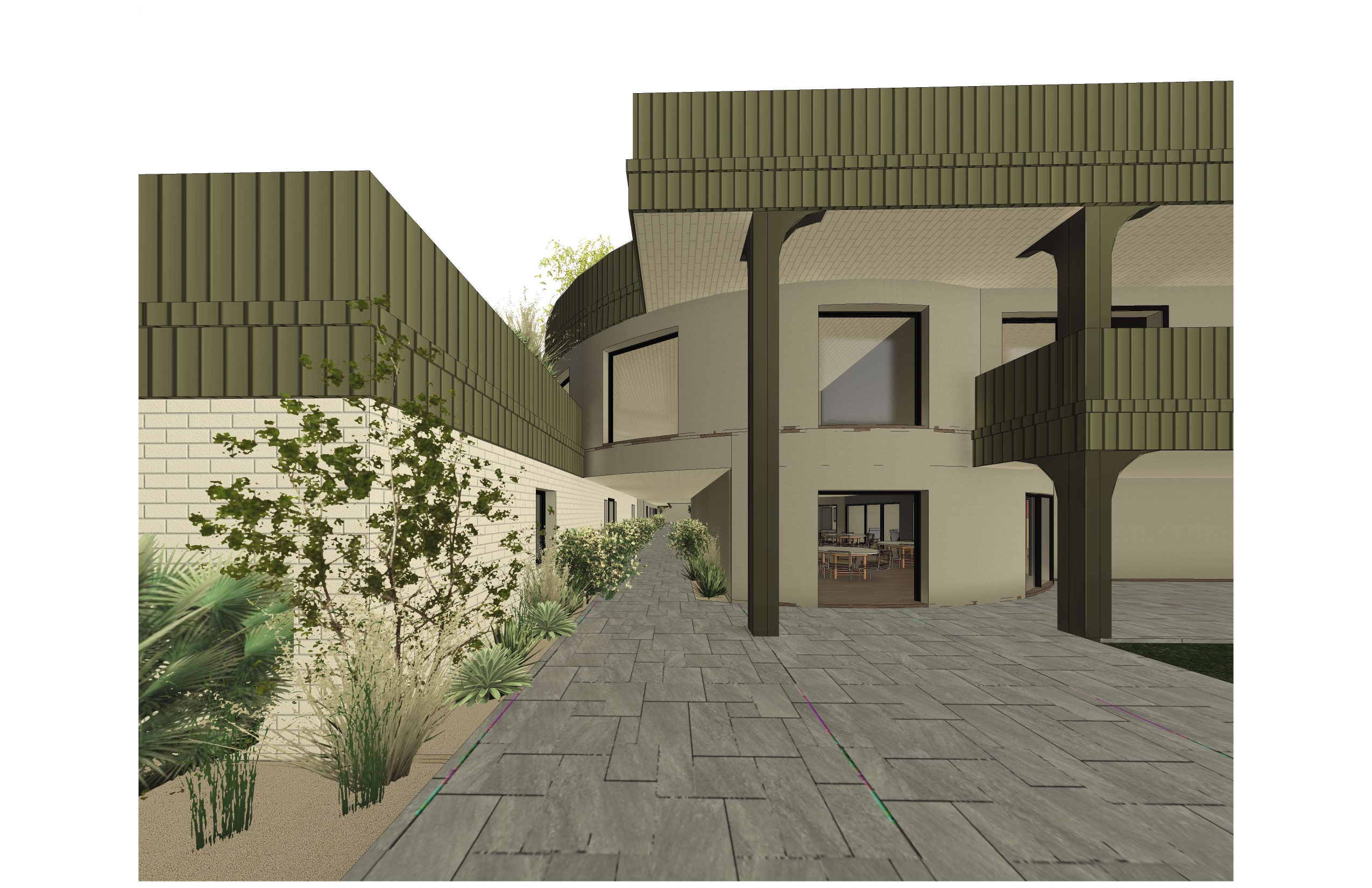 a modern architectural scene depicting a circular building with a green metallic facade rendered with realistic textures the walls are a soft cream brick and beige stucco and the roofs and pillars feature a muted olive hue metal material lush greenery including various plants and shrubs with shades of green and beige line the pathway adding a natural touch the concrete pattered to look like stone pathway is detailed with shades of gray featuring subtle reflections for realism the atmosphere has a serene and inviting feel with soft natural lighting casting gentle shadows underside of roof is a matching beige stucco to walls