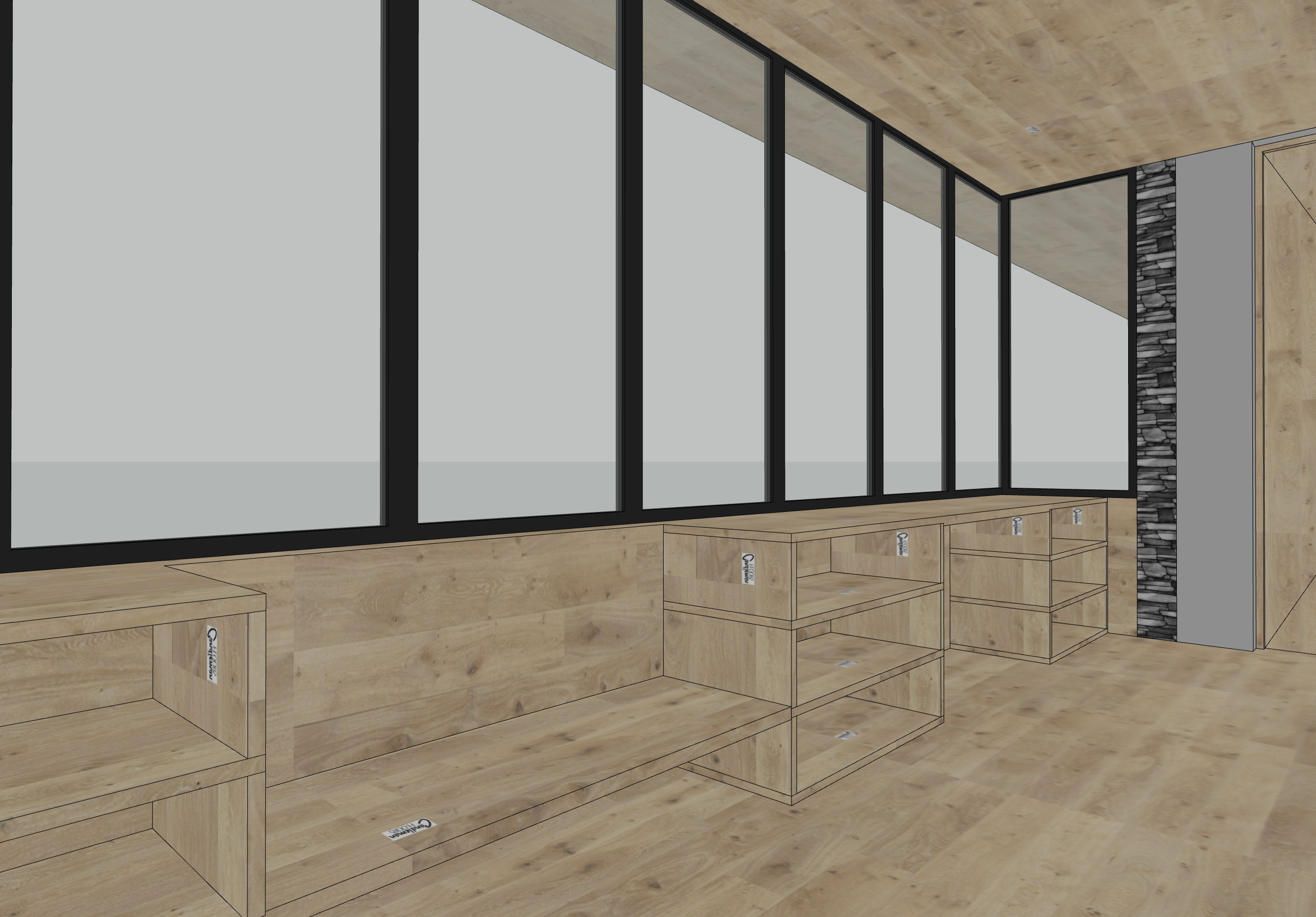 this is a hallway with a cosy reading nook a modern interior room with a cozy and warm atmosphere the walls are painted in a soft neutral gray the wooden floor ceiling desk and cabinetry are made of light oak wood giving a natural and inviting feeling the large window features dark framing offering a glimpse of soft diffused natural light this is a kids room suite bedroom add in soft led lighting and artwork onto the walls the headboard runs the full width of the wall the wood tones are light oaks add pillows and soft finishings to the bed and surrounds the view through the window is of beautiful mature african trees