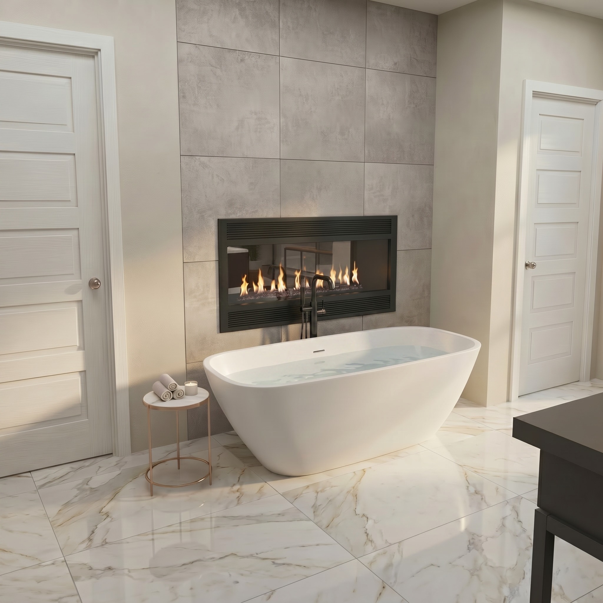change the floor mount tub faucet to a deck mount faucet in black on top of the middle back of the tub and change the floor tile to less marbling and slighting more gray toned