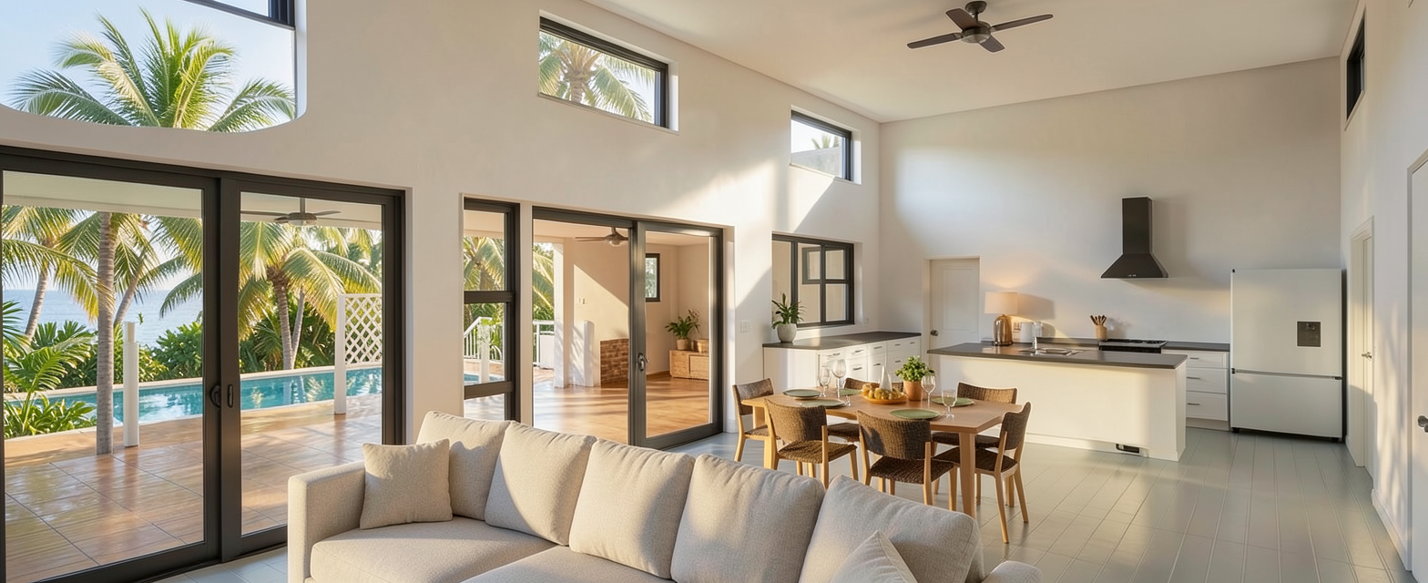 a manicured lawn layered flower beds low maintenance shrubs add a rectangular pool perpendicular to the house on the far left side of the house add a rectangle gazebo with teak furniture and white cushions add fancy landscaping put a black aluminum dance around the pool and gazebo add an outdoor kitchen near the patio stairs add a teak dining set near the outdoor kitchen add a light gray slide to the far left side of the pool make the siding sherwin williams iron ore color do not add any brick or stone make the roof charcoal make the windows black add a narrow diamond paver and turf design to the right side of the pool inside the fence with teak lounge chairs with white cushions make it just before dusk add string lights above the dining table