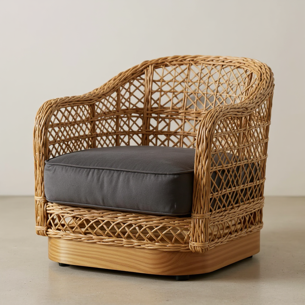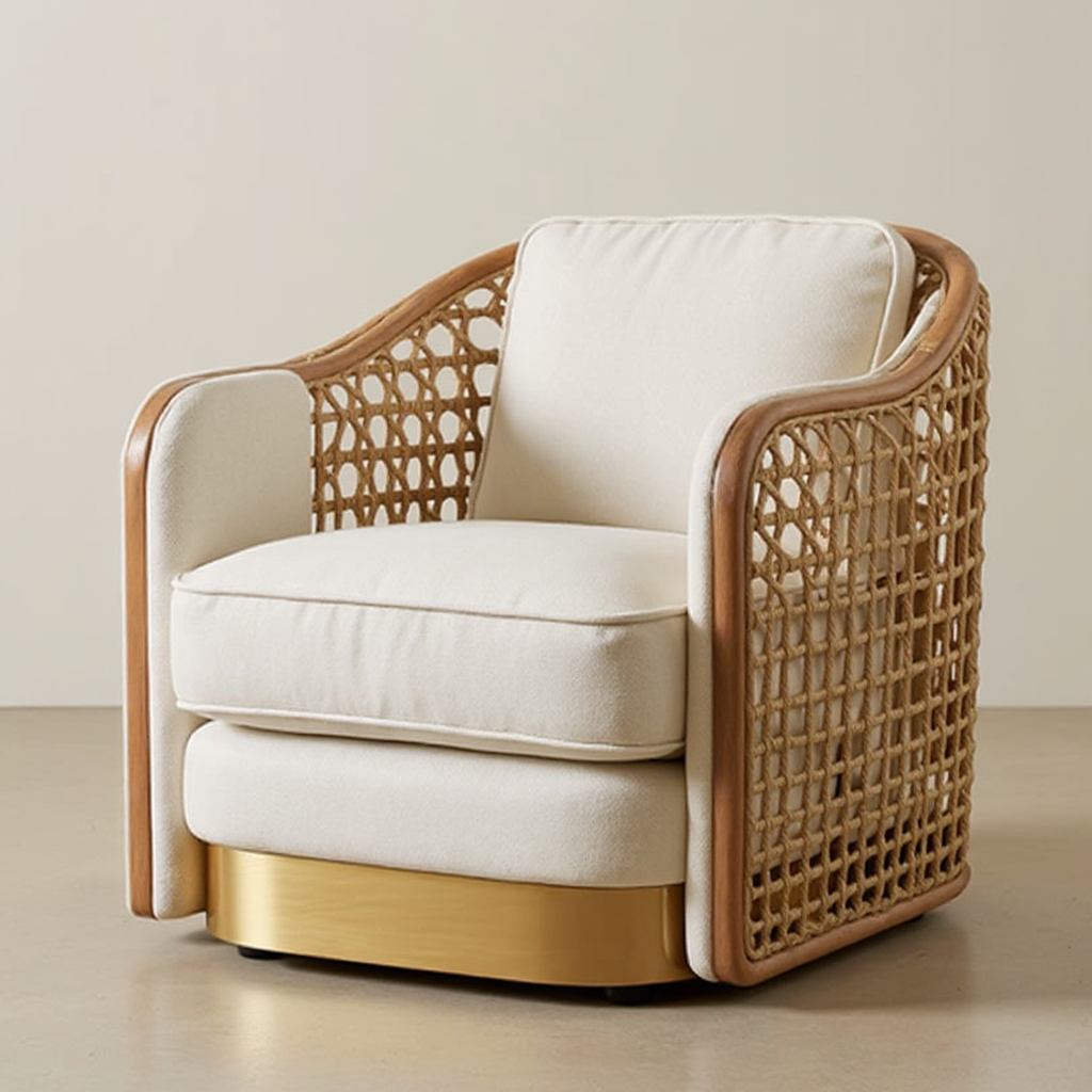 accent rope weaving arm chair wood base finish upholstered white seat and back