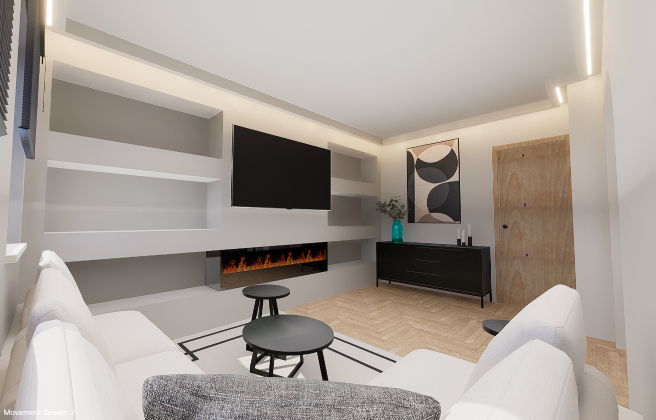 make this modern living room look more realistic with warm natural light and better materials add a white skirting board around the room and add some nice ornaments on the media wall
