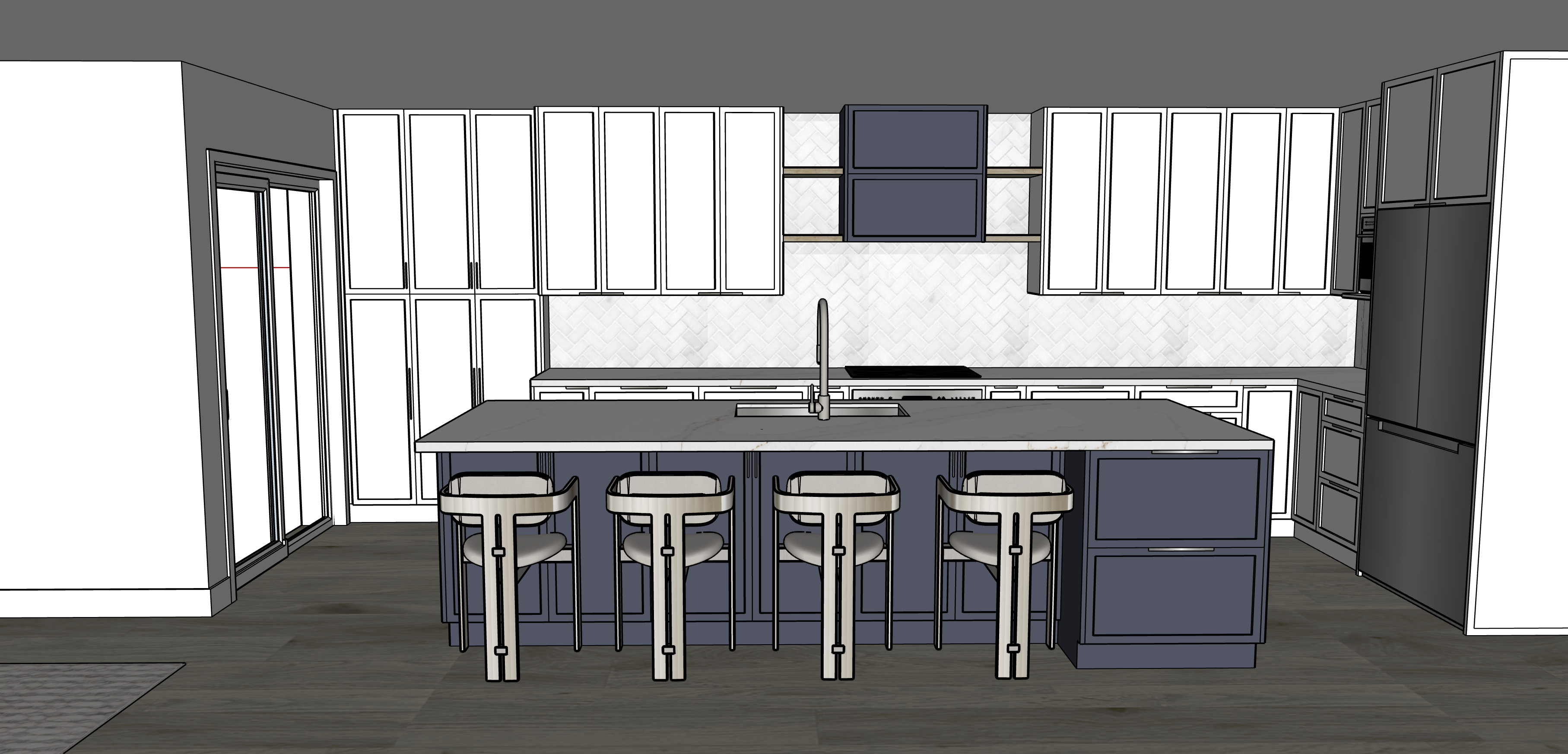 ensure even lighting throughout drawing kitchen cabinets should be white as per model navy blue island as an accent straight plank flooring