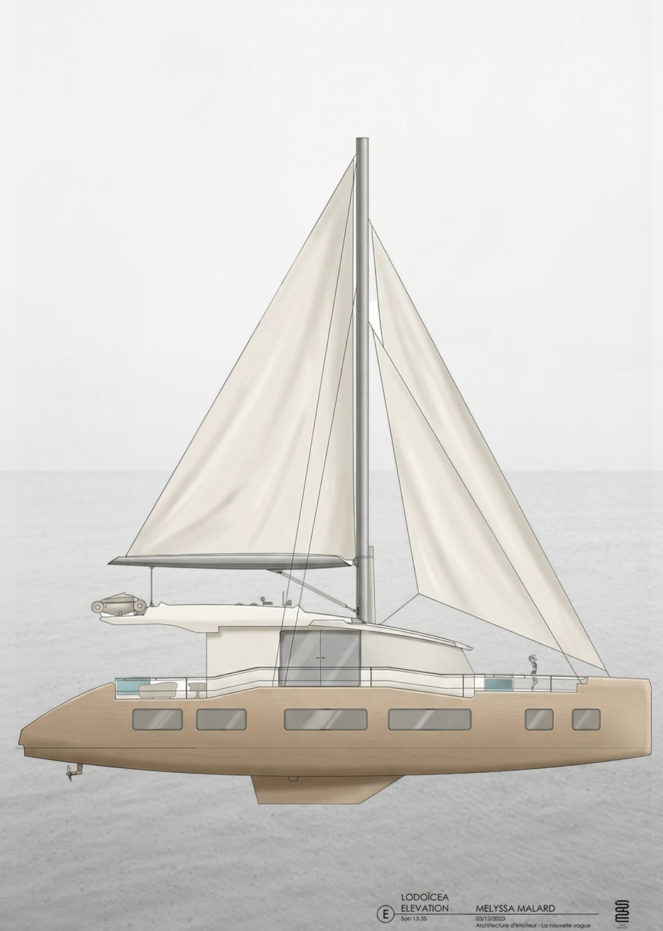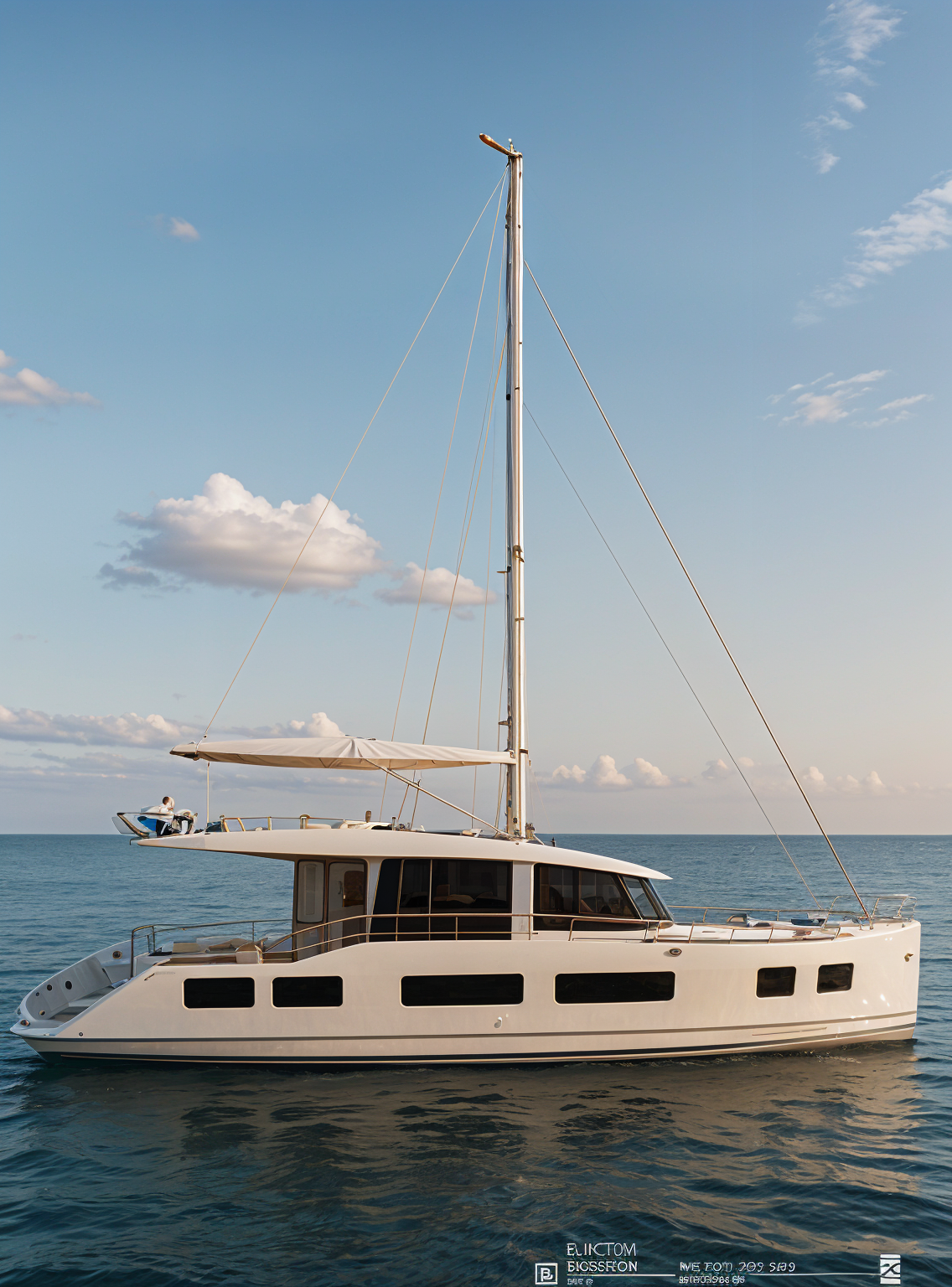 refine this catamaran design into a sleek elegant luxury vessel inspired by spa architecture and seychelles resort aesthetics keep the overall structure and proportions but redesign the upper cabin and volumes with a lighter more sculpted shape introduce clean horizontal lines large openings refined wood accents natural textures and soft curvature inspired by contemporary yacht design avoid boxy or bulky forms no caravan look no thick rounded blocks incorporate elegant glazing shaded terraces and refined minimalistic detailing style references aman resorts alila villas scandinavian minimalism and modern catamarans by sunreef or lagoon sixty 7 atmosphere warm natural tropical high end well being