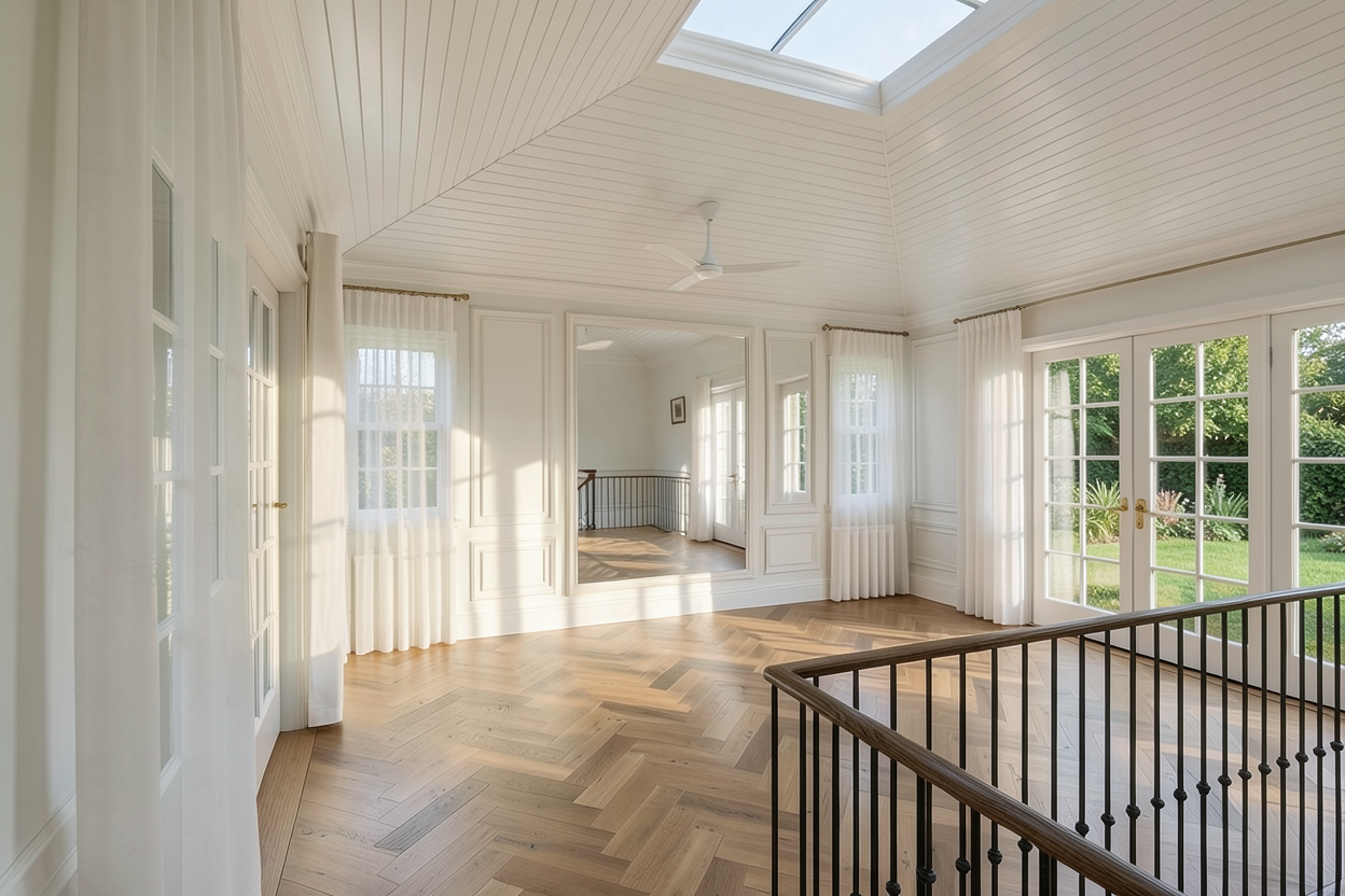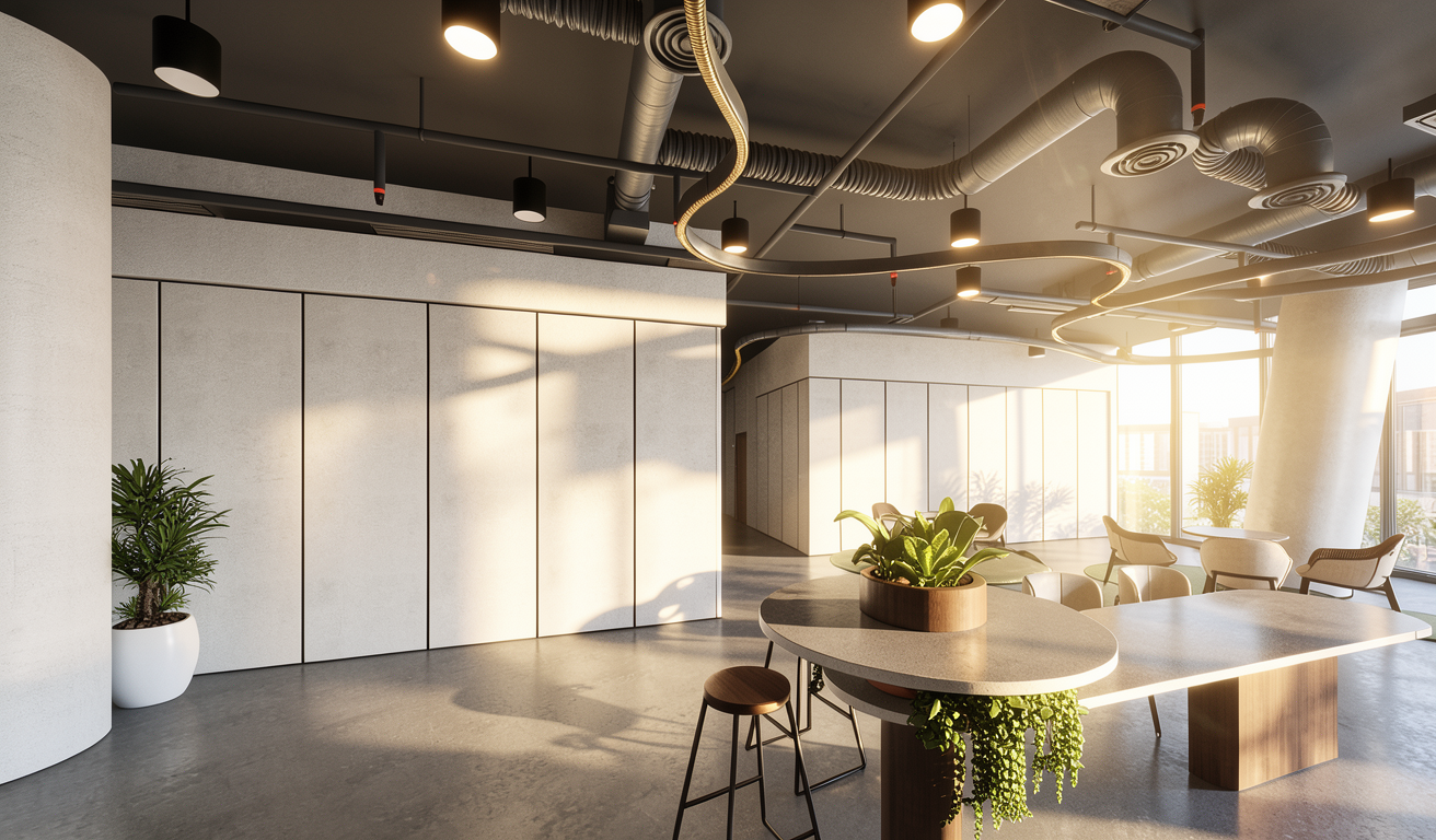 convert this floor plan into a architectural isometric 3d view of a office show the space from an elevated angle with furniture walls and details visible upper level of a loft office space medium tone wood floors black steel stairs off white modular sofa white round pedestal meeting table with black swan chairs light wood low cabinets and one side full height book case use the same furniture as shows on the plan do not change the orientation of the floorplan