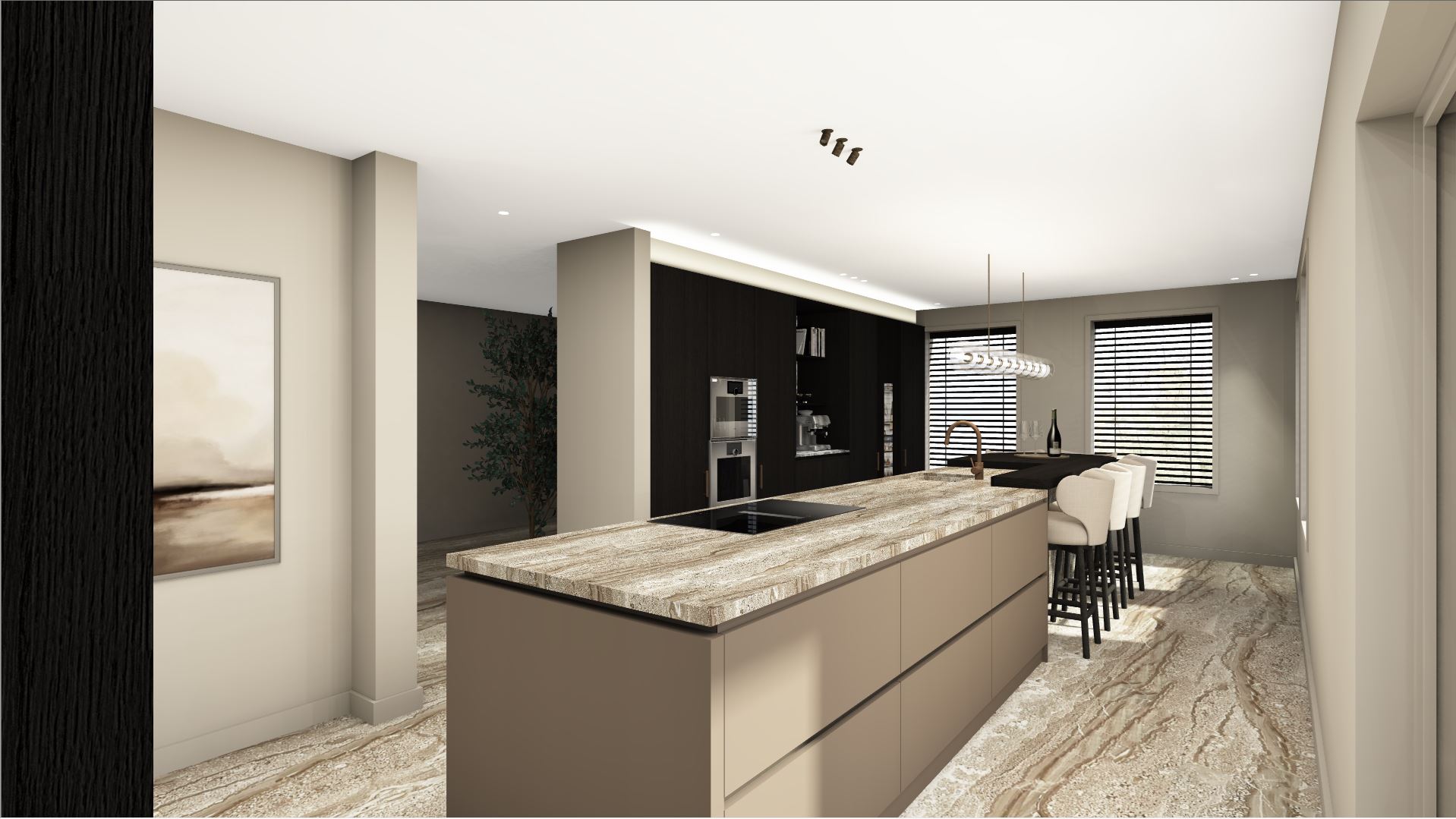 enhance this image to ultra photorealistic quality preserve the exact geometry proportions layout materials colors textures and all design details exactly as shown do not add remove redesign restyle or reinterpret anything do not change materials colors lighting direction furniture dimensions or composition no new objects no decorative additions no artistic reinterpretation only improve realistic lighting natural shadows material realism true to life surface rendering reflections depth and camera realism high end architectural photography quality the final image must be a 1 1 faithful photorealistic version of the original design only change the colour of the island doors it has to be a bit lighter cream grey