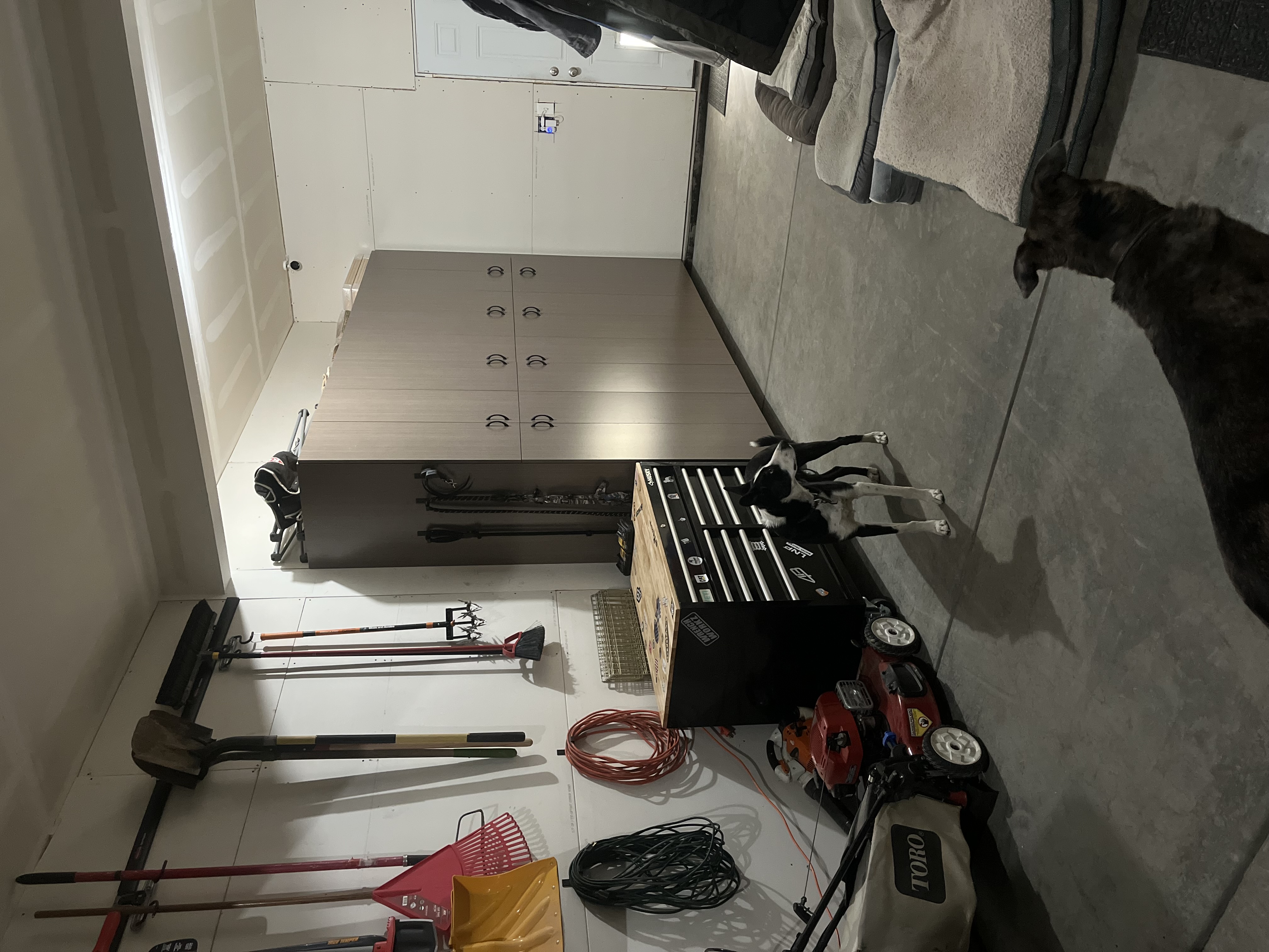 keep the cabinets and the overall layout of the room but restage this entire garage to remove the dogs and dog beds and make the garage look better