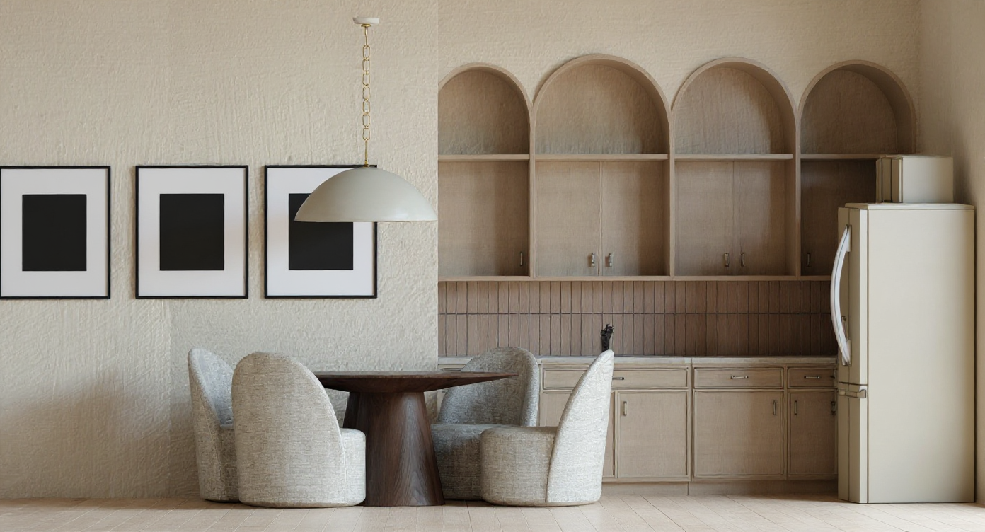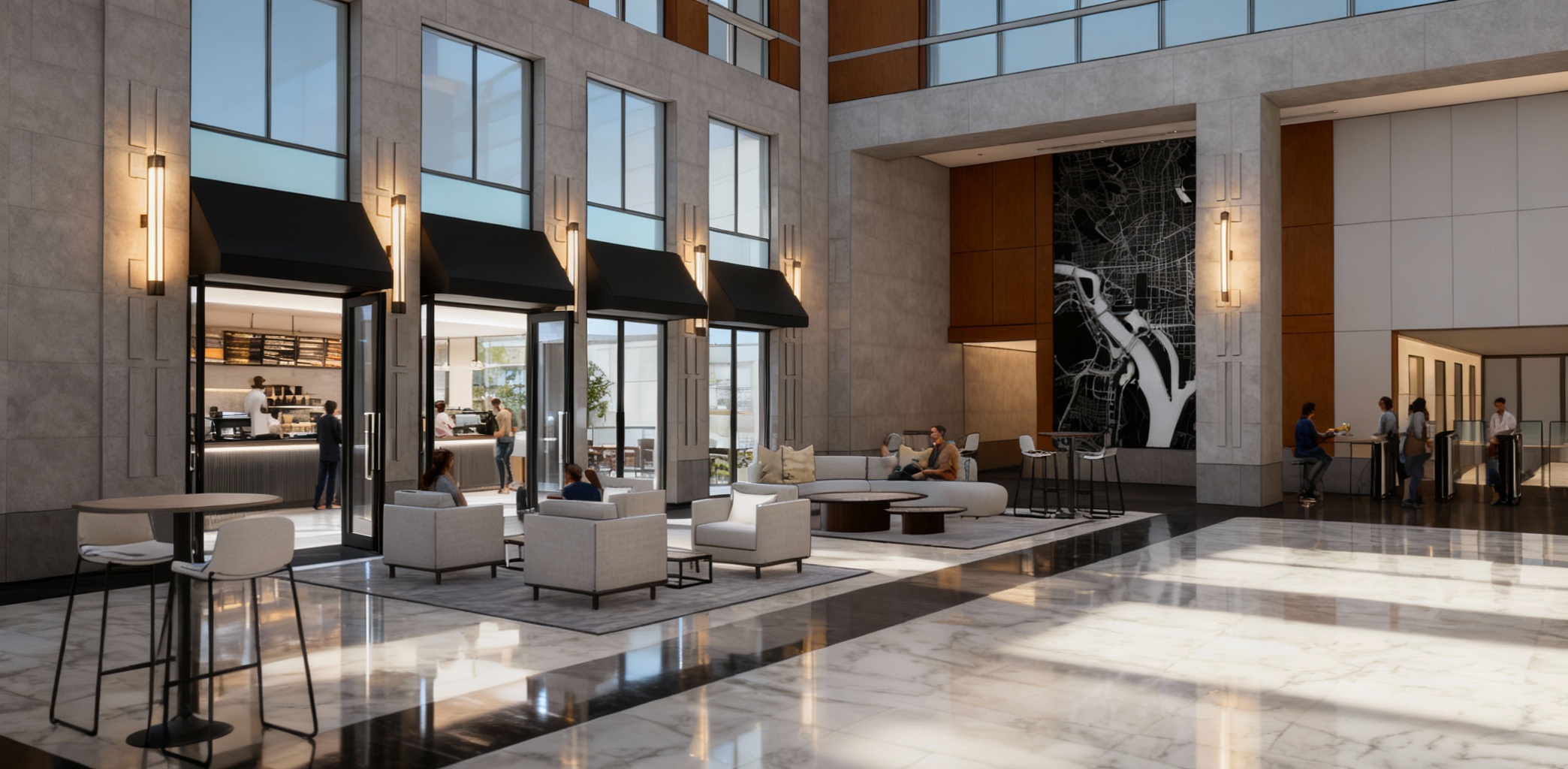 render atrium lobby open doors under awnings that display a modern sleek cafe add upscale people lounging and interacting fill lobby with natural light and turn on interior sconces