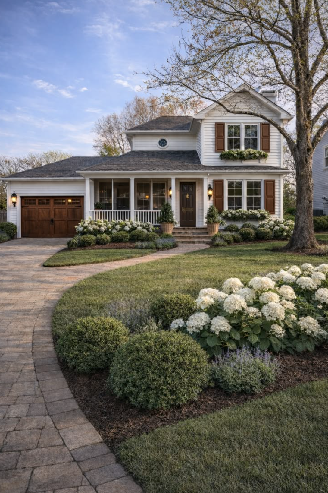 exterior shot i want this landscaping used as inspiration keep the front of the l shaped entry pavers clear do not change the layout of the existing pavers and walk way stones