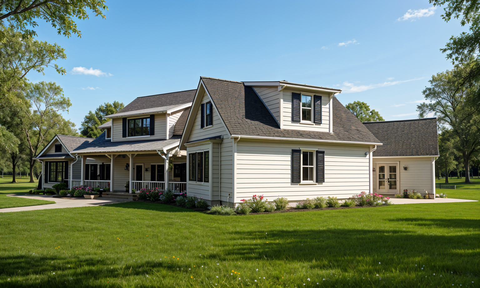 the small house on the right should have a plastered facade in a light sand color and a plant roof that looks like a meadow the barn on the left should have a fulur d standing panel the green wavy line on the right of the small house is a smaller mountain the mountain is a swedish west coast granite and about twice as high as the house quite flat but reaches far ahead make the ground look like gravel and make the woman look lika a apple farmer