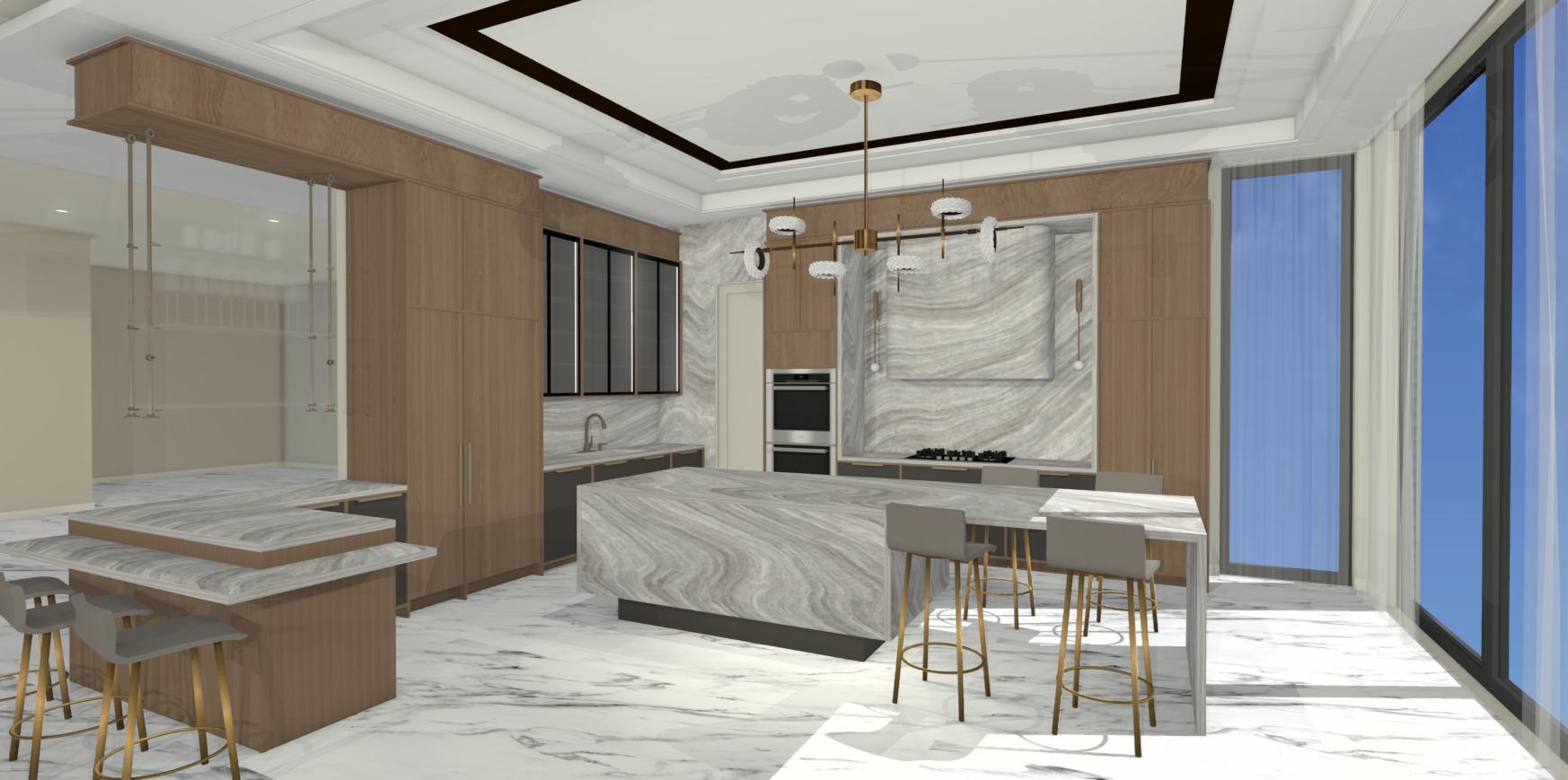 ultra photorealistic high end interior render of a modern luxury kitchen strictly keep the original design layout camera angle proportions cabinet style island shape ceiling details windows and all architectural elements exactly the same as the reference image no redesign no changes in structure no repositioning of any element enhance only materials lighting and realism to a premium level cabinets maintain existing design finish in a refined combination of matte wood texture and matte dark grey tones soft touch surfaces with subtle realistic reflections countertop backsplash full height bookmatched slab stone option 1 calacatta gold marble with bold elegant veining option 2 dramatic dark marble nero marquina style with high contrast veins seamless waterfall edges on island hood brushed metal finish stainless steel or champagne tone clean minimal slightly reflective surface lighting continuous warm led strip under all base cabinets toe kick lighting soft glow reflecting on floor soft indirect ceiling lighting realistic chandelier glow warm tone 3000k natural daylight from windows with soft shadows material realism physically accurate materials pbr subtle imperfections micro scratches natural variation in stone and wood grain soft reflections on polished marble floor atmosphere cinematic lighting balanced exposure global illumination ray tracing soft shadows ambient occlusion slight depth of field for realism render quality ultra high resolution 8k sharp details noise free photorealistic showroom quality final instruction strictly preserve original design no modifications no reinterpretation only material lighting and realism enhancement