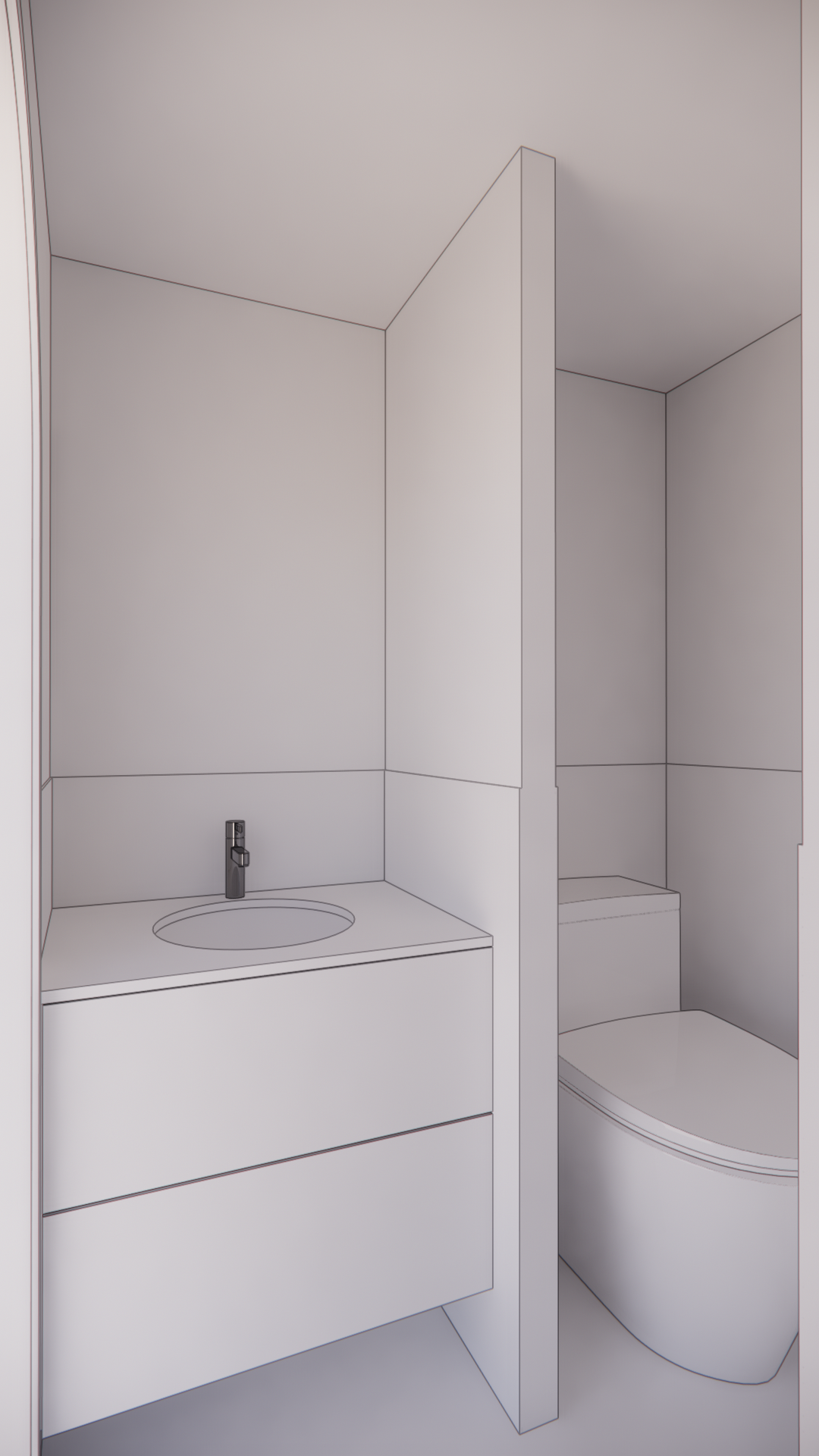 modernist exterior shot render and add materials mirror color tone is grey with white basin top architecture