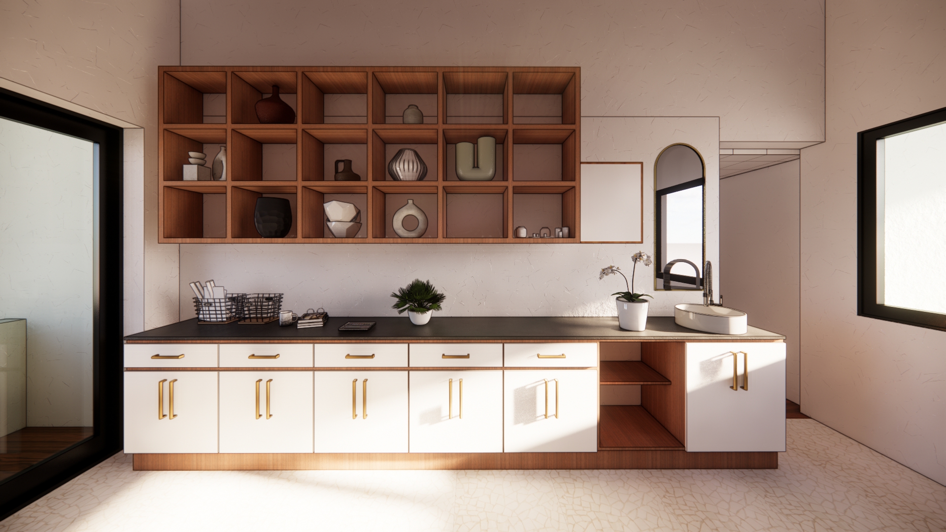 improve this art studio render while keeping the existing furniture and layout enhance textures walls floors furniture and materials for a more realistic and high quality appearance add ceiling lighting to illuminate the space naturally creating a bright and functional atmosphere suitable for an art studio make the scene look lifelike with realistic materials shadows and depth