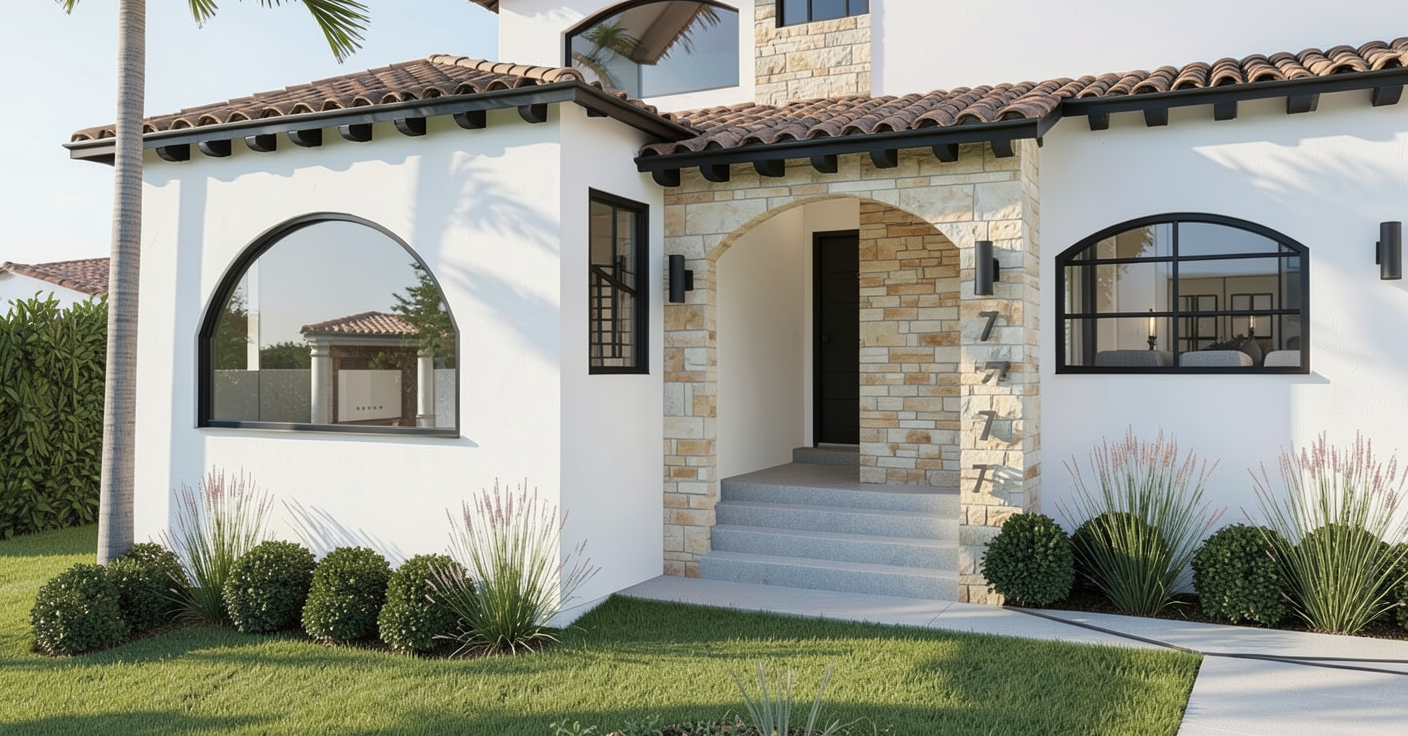 make the house white middle section light color stone veneer all window and doors black frames under eave black beams spanish clay roof add house around