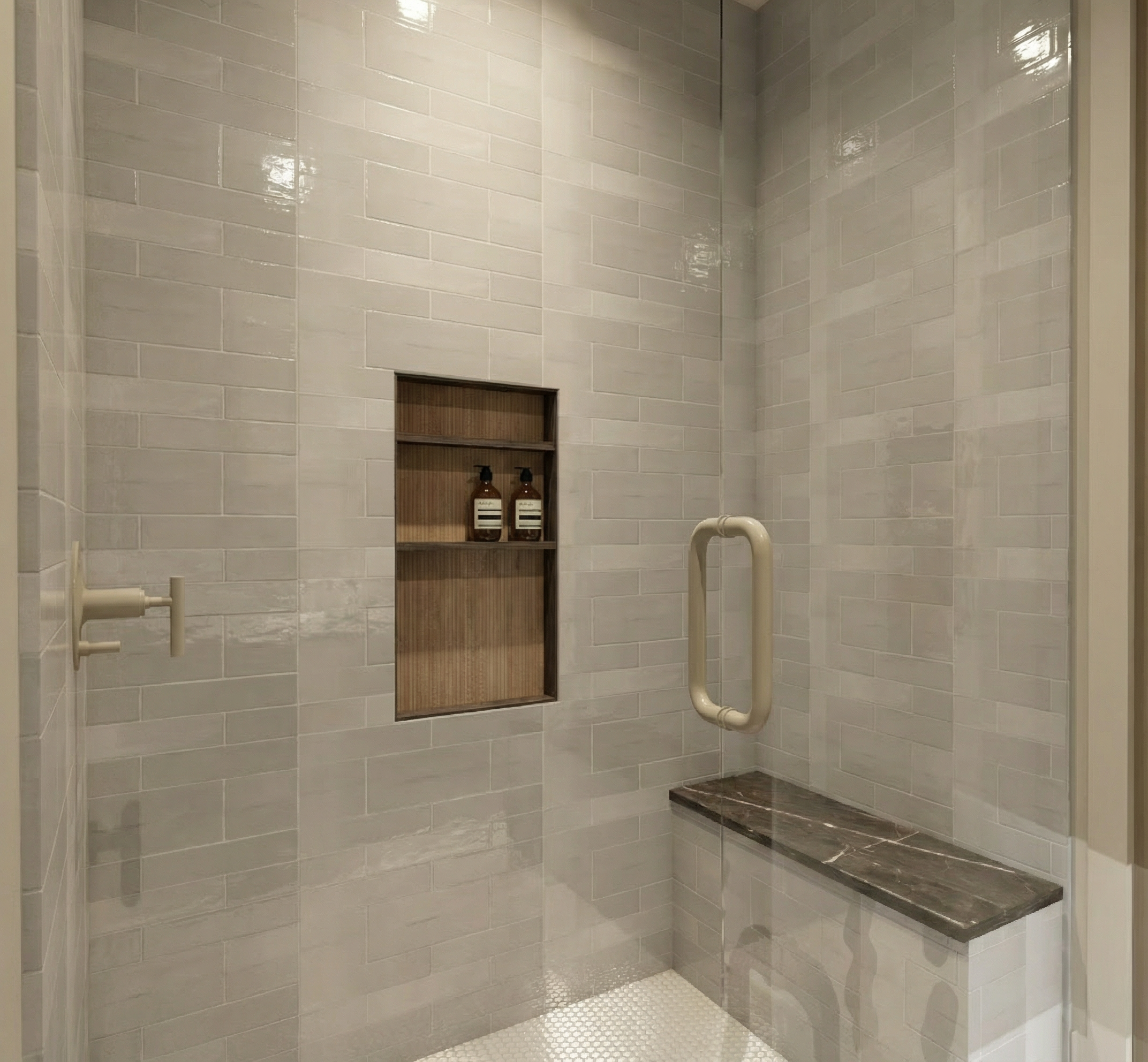 add a modern mirror to this vanity and change floor to white hexgon tile countertop white with gray veins