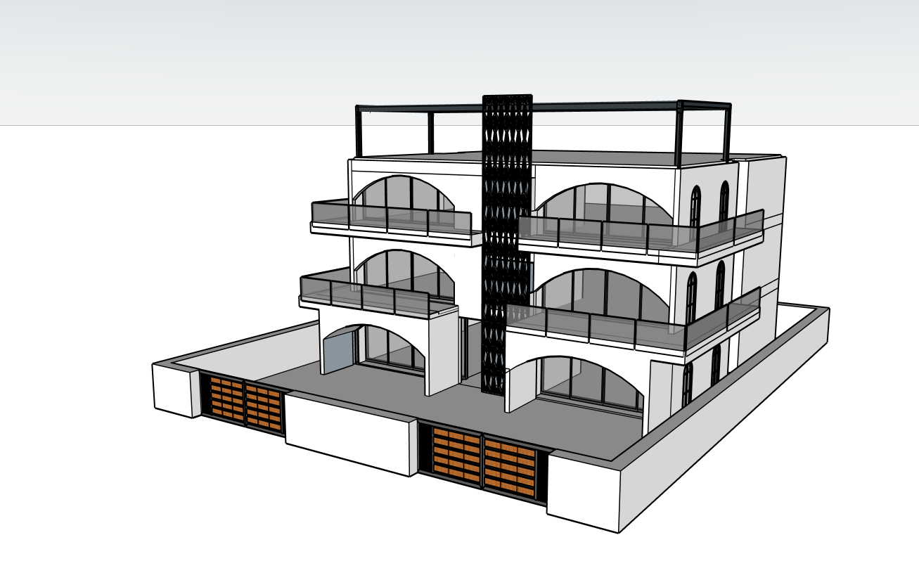 use the sketchup screenshot as a loose reference for general scale and footprint but reimagine the building as a luxurious 3 floor apartment complex in djibouti elevate the massing with elegant volumetric shifts terraces and refined proportions design the facade using high end materials like natural stone travertine smooth stucco and bronze or black metal accents feature large floor to ceiling windows shaded private balconies vertical fins or louvers for sun control and lush rooftop or terrace greenery the balconies have glass railings as well as shadded louvers on the arched openings that are on the top two floors make those louvers visible and uniform on all of the balconies highlight landscaped entrance areas ambient pathway lighting and modern exterior furniture the environment should include palm trees tropical plants and clean urban pavement realistic midday lighting with sharp shadows soft reflections on glass and a warm elegant ambiance ultra detailed cinematic realism with high fidelity and rich architectural textures set the scene on afternoon with sharp shadows adding light fixtures to the building enhancing material richness the surrounding context should show neighboring houses in close proximity reflecting typical djiboutian architecture flat roofs textured facades and small scale local character include tropical landscaping palm trees climbing plants and stone paving for a lush high end feel realistic photo grade render with cinematic atmosphere and no visible post processing artifacts