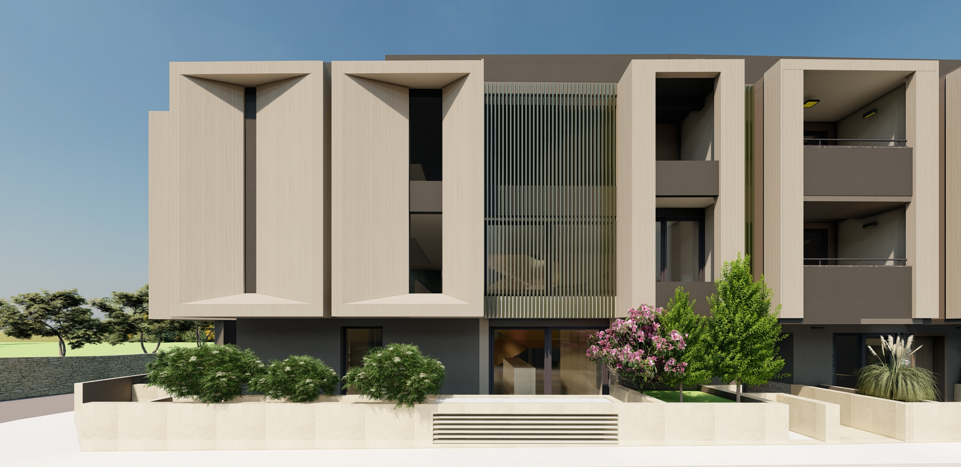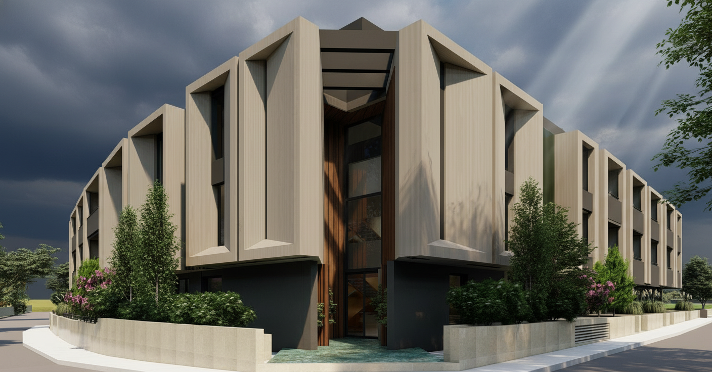 make the environment more dramatic including the sky but make it sunny the yellow is a stone look cladding with vertical grooves add a ciantar company logo in the area where there are the louvers