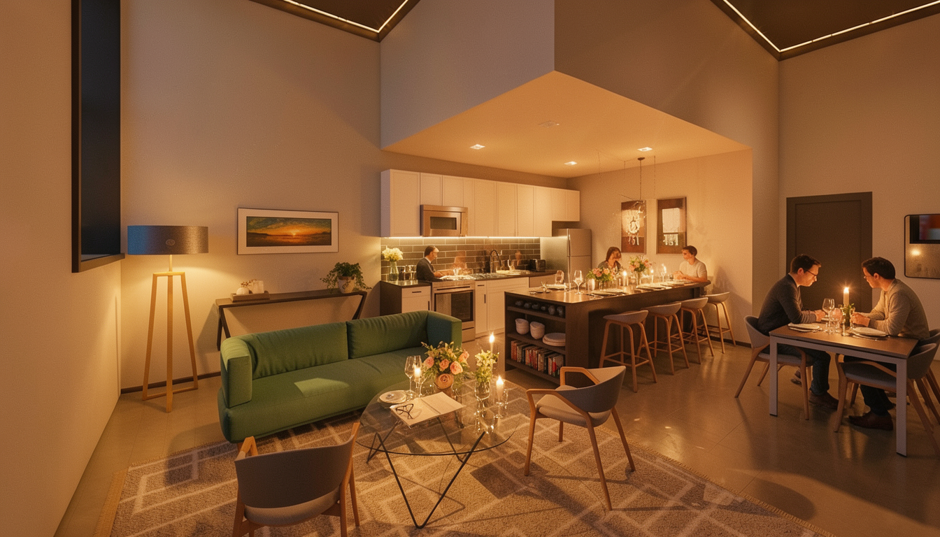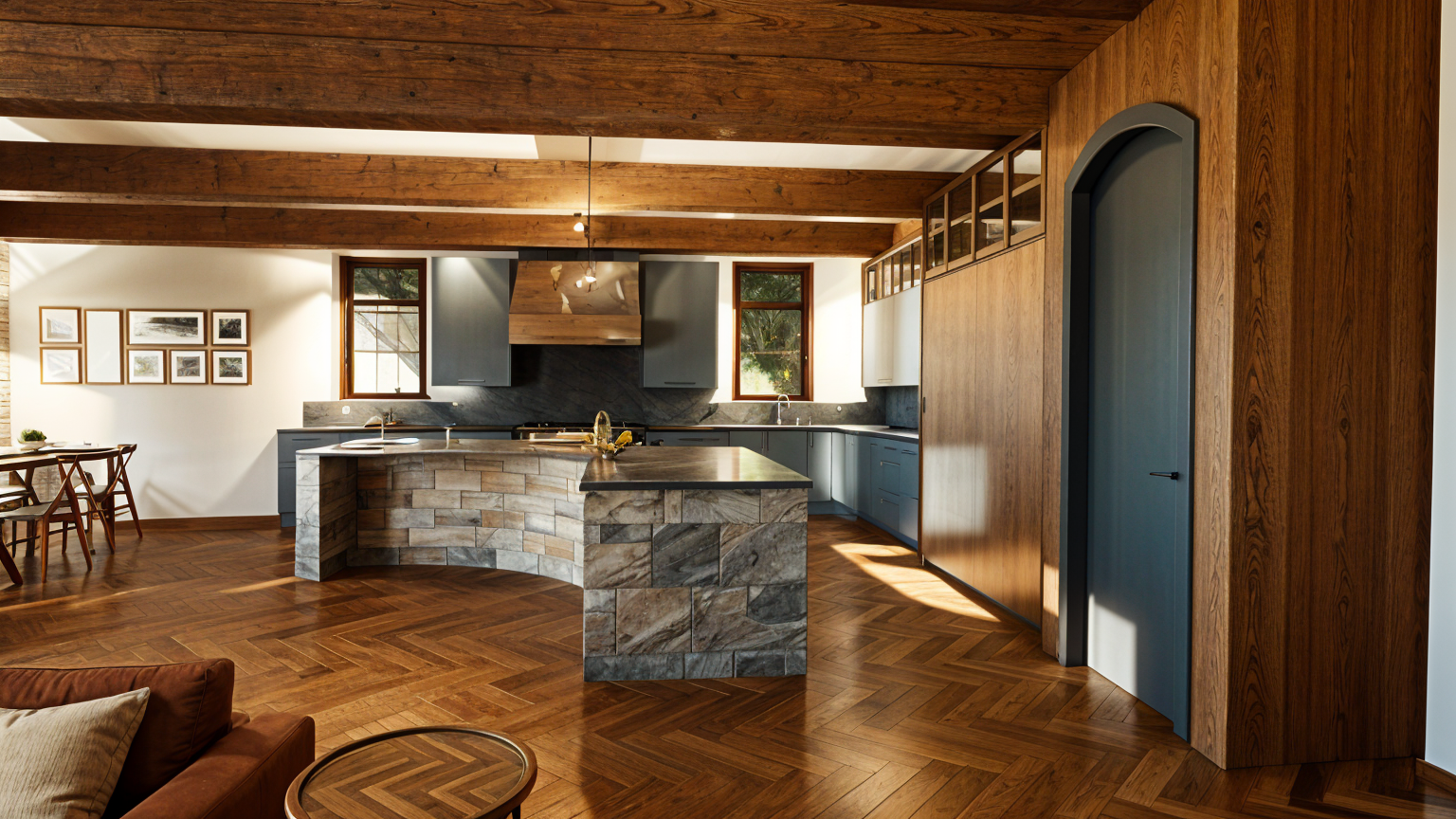 warm and inviting interior space a few decorative light fixtures kitchen island on left side grassy idaho rolling hills landscape tetons very small in far distance