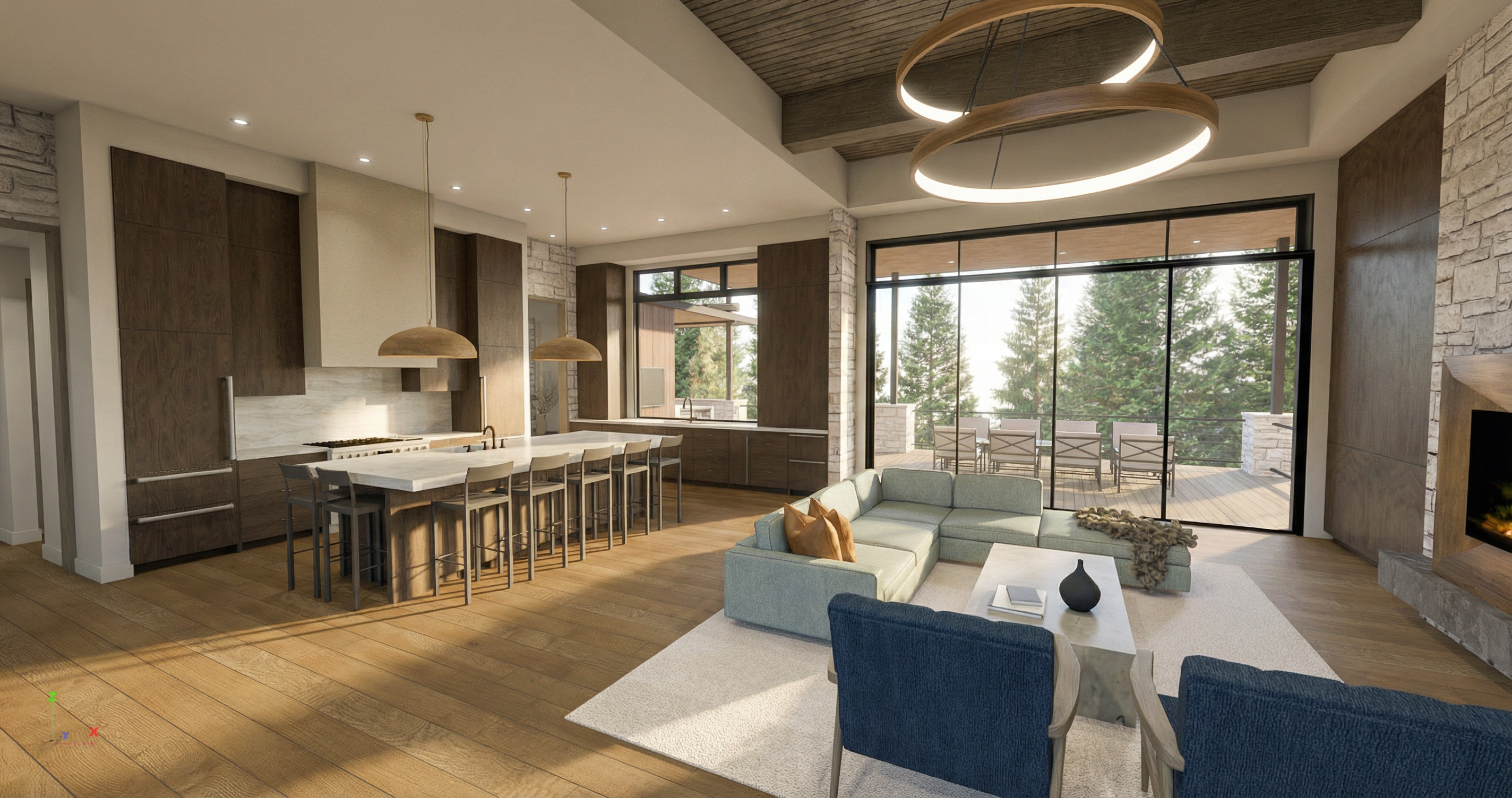 architectural visualization of an open air quincho outdoor barbecue pavilion approximately 4x4 meters cementitious flooring with a strong concrete appearance light to medium gray matte finish black ceramic elements clearly visible and defined strong presence of dark wood elements throughout the project with dark stained wood used in finishes and details structural columns and beams made of metal in deep graphite gray ceiling made of dark pine wood slats rich and warm in tone built in concrete furniture and countertops with a raw minimalist finish emphasizing the contrast with the dark materials behind a dark wood lattice screen a bougainvillea climbing and weaving through the lattice with red colored leaves adding vibrant contrast a person grilling at the built in concrete barbecue subtle smoke rising and several people seated on chairs around a table relaxed and social atmosphere behind the quincho a small patio finished with light gravel shells conchuelas and in the background a vertical dark wood fence modern minimalist chilean residential architecture realistic human scale natural interaction soft natural daylight high detail architectural render style dark all wood