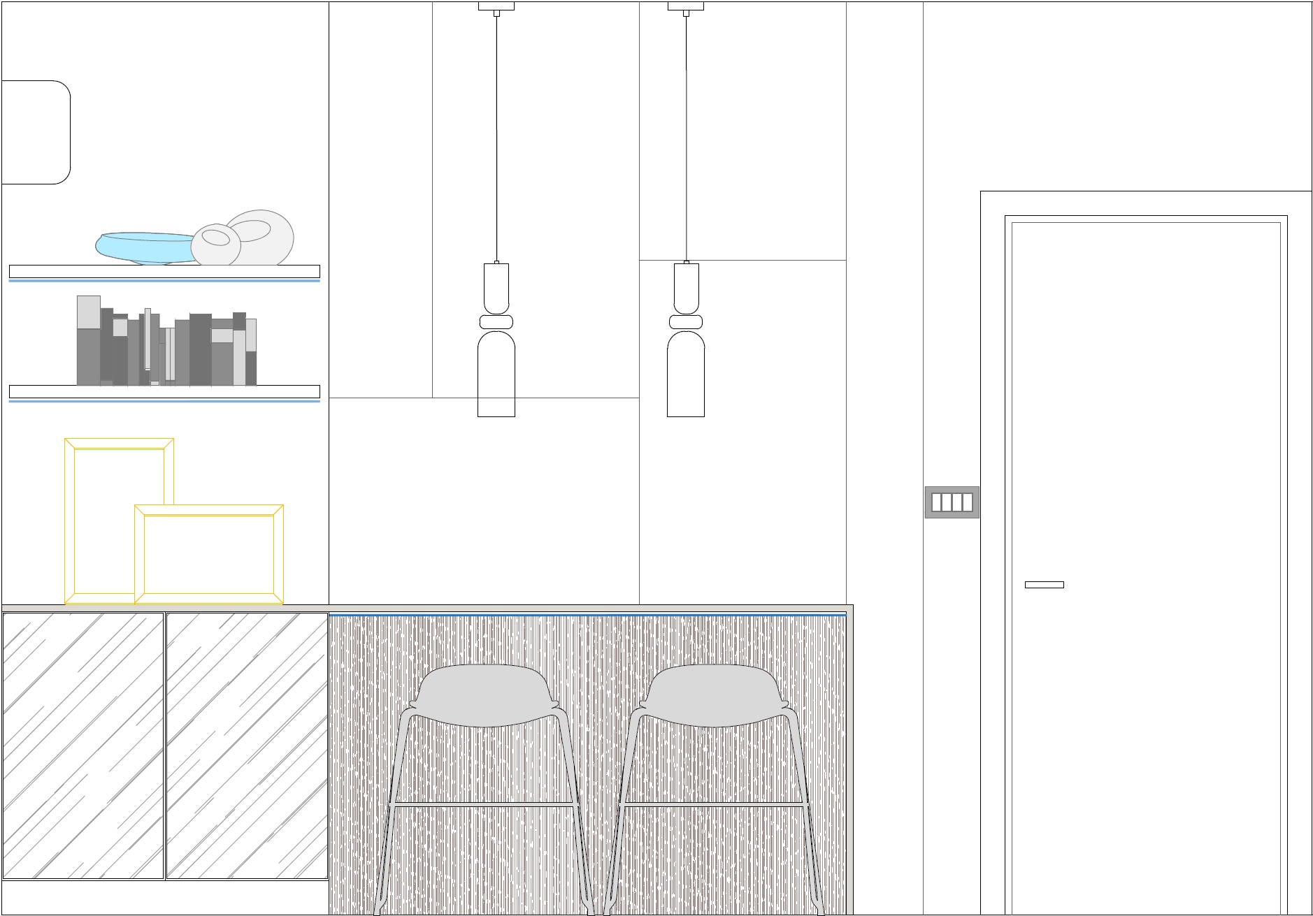 pogled ka sanku i kuhinju zid bez boje ulazna vrata bele boje prekidac pored vrata bele boje 160cm ispred zida sa vratima je sank u visini 90cm duzine 130cm sa dve barskke stolice radna ploca i bocna ploca kamen udubljenje za stolice od drveta i skrivena rasveta sa radne ploce baca svetlmo na drvena ledja sanka desno do sanka dvokrilna komoda sa ogledalima na frontovima iza komode je zid bez boje na kome su dve drvene konzolne police sa skrivenom rasvetom
