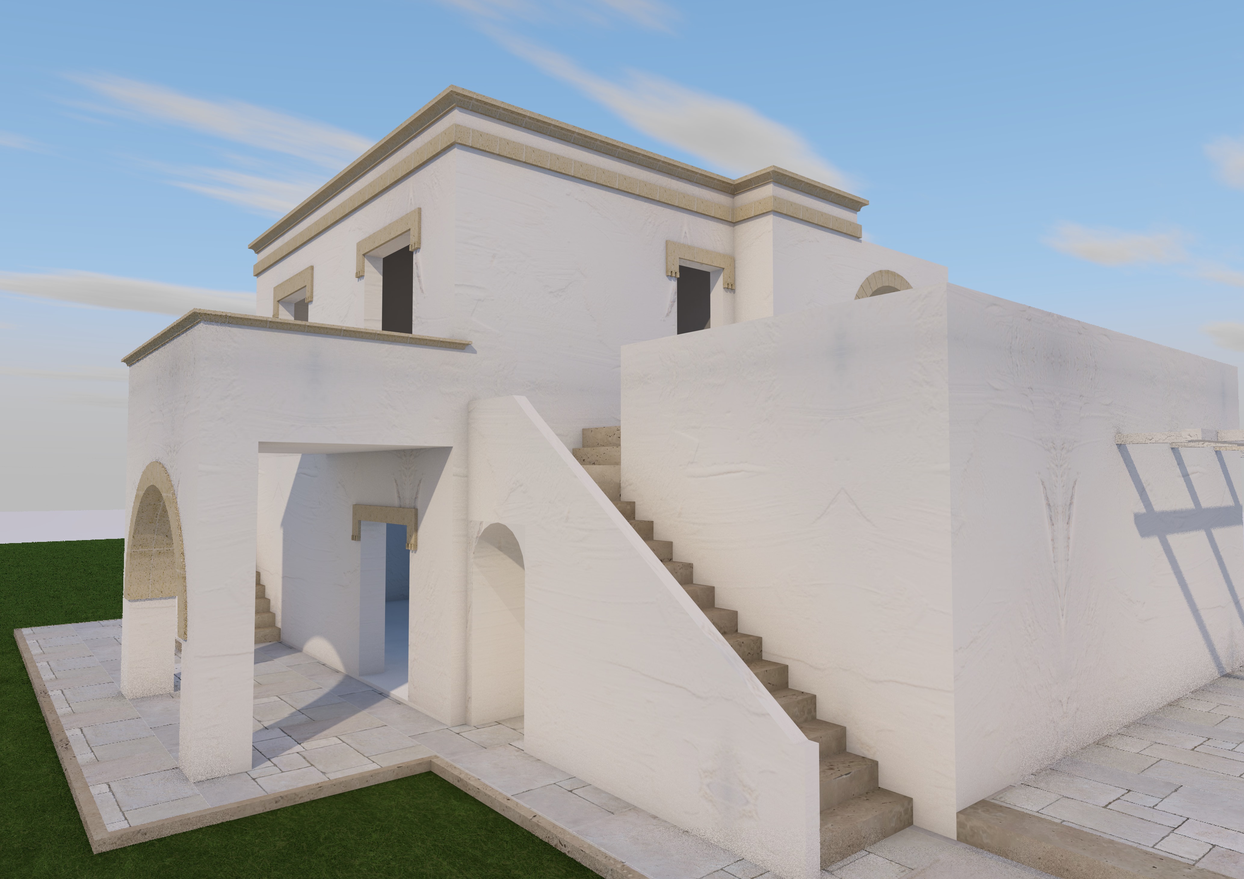 exterior architectural rendering contemporary mediterranean villa soft natural daylight golden hour sunlight white plaster walls local stone cladding 8k render