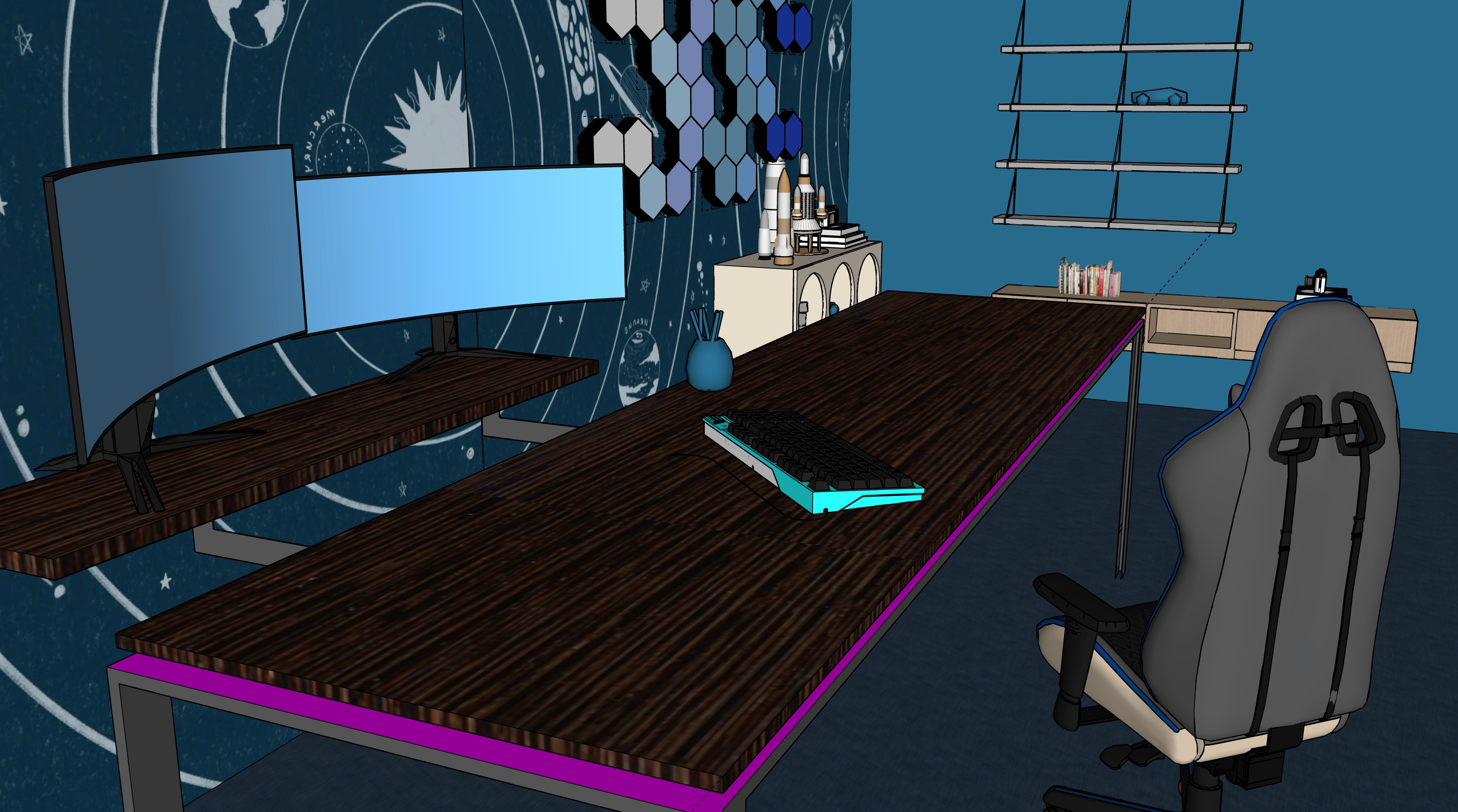 12 year old gamers room add some posters especially back wall purple neons underneath the shelves gaming room cluter and light no people