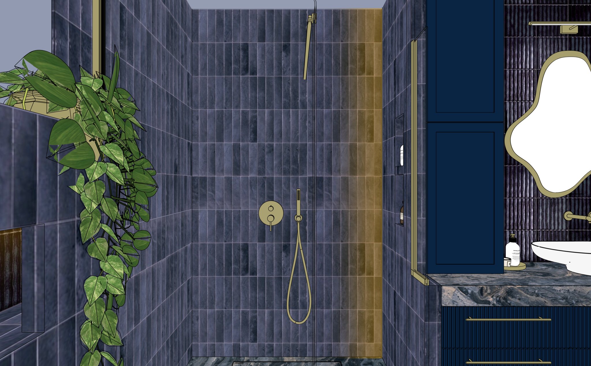nie zmieniaj geometrii perspektywy tekstur mebli kolor w nie dodawaj adnych element w dekoracyjnych ani mebli szafki s lakierowane matowym lakierem kafelki s polerowane p ytki pod ogowe s matowe blat pod umywalk jest polerowany lustro jest pod wietlane od ty u po lewej stronie od wn k na kosmetyki pod prysznicem w2 naro niku jest pionowy profil led po lewej stronie poza kadrem jest malutkie okno popraw wizualizacj eby by a hiperrealistyczna