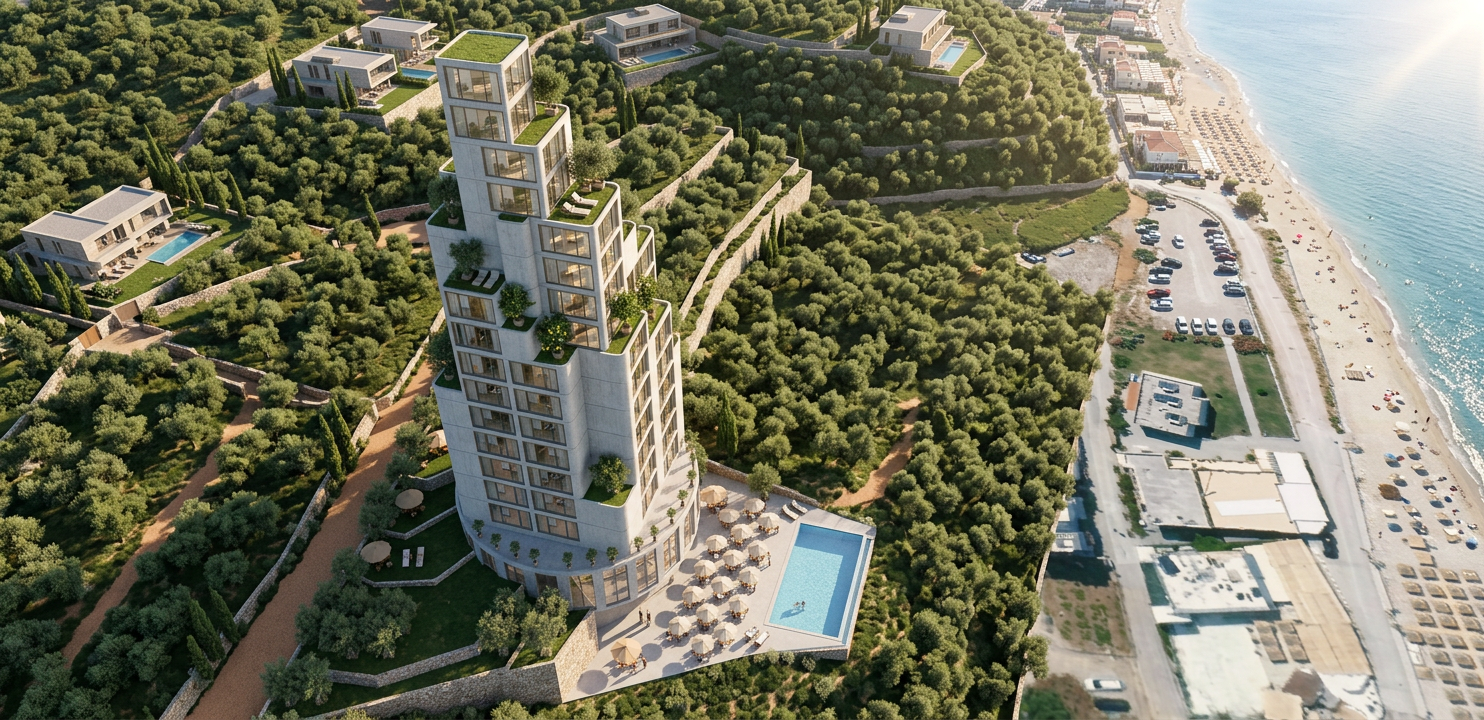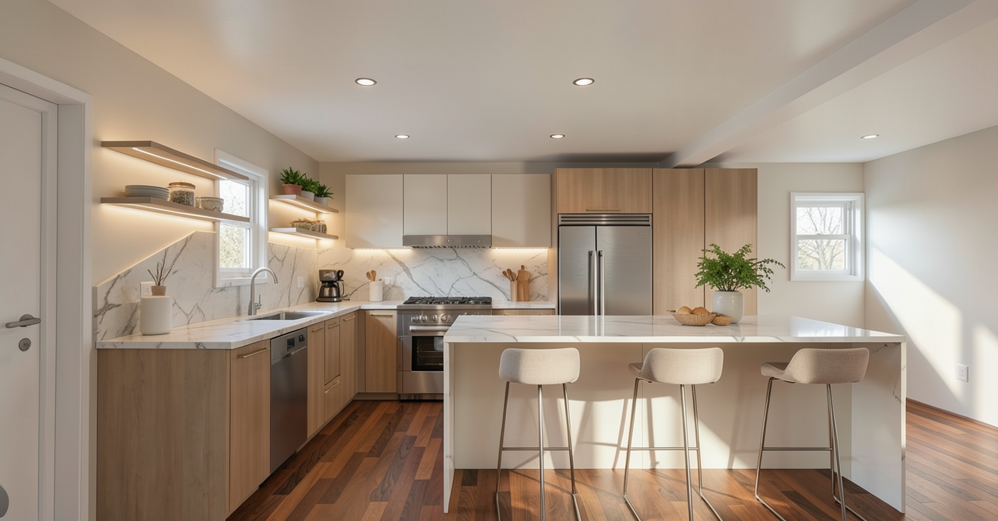 generate a realistic render of a modern house featuring a red brick exterior with large reflective glass windows on the left side the balcony railings are sleek black metal on the right side the balcony railing is black wooden the balcony subfloor is vetrical black wooden cladding the scene is set in a serene sunny afternoon with a clear blue sky the surrounding landscape includes lush vibrant green grass and a clean white concrete pathway show a wooden fence behind the house