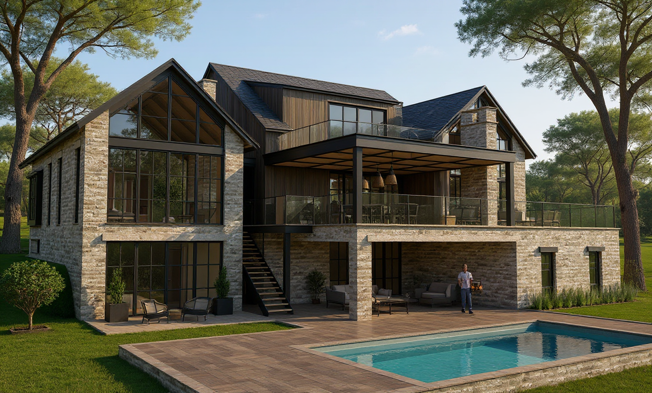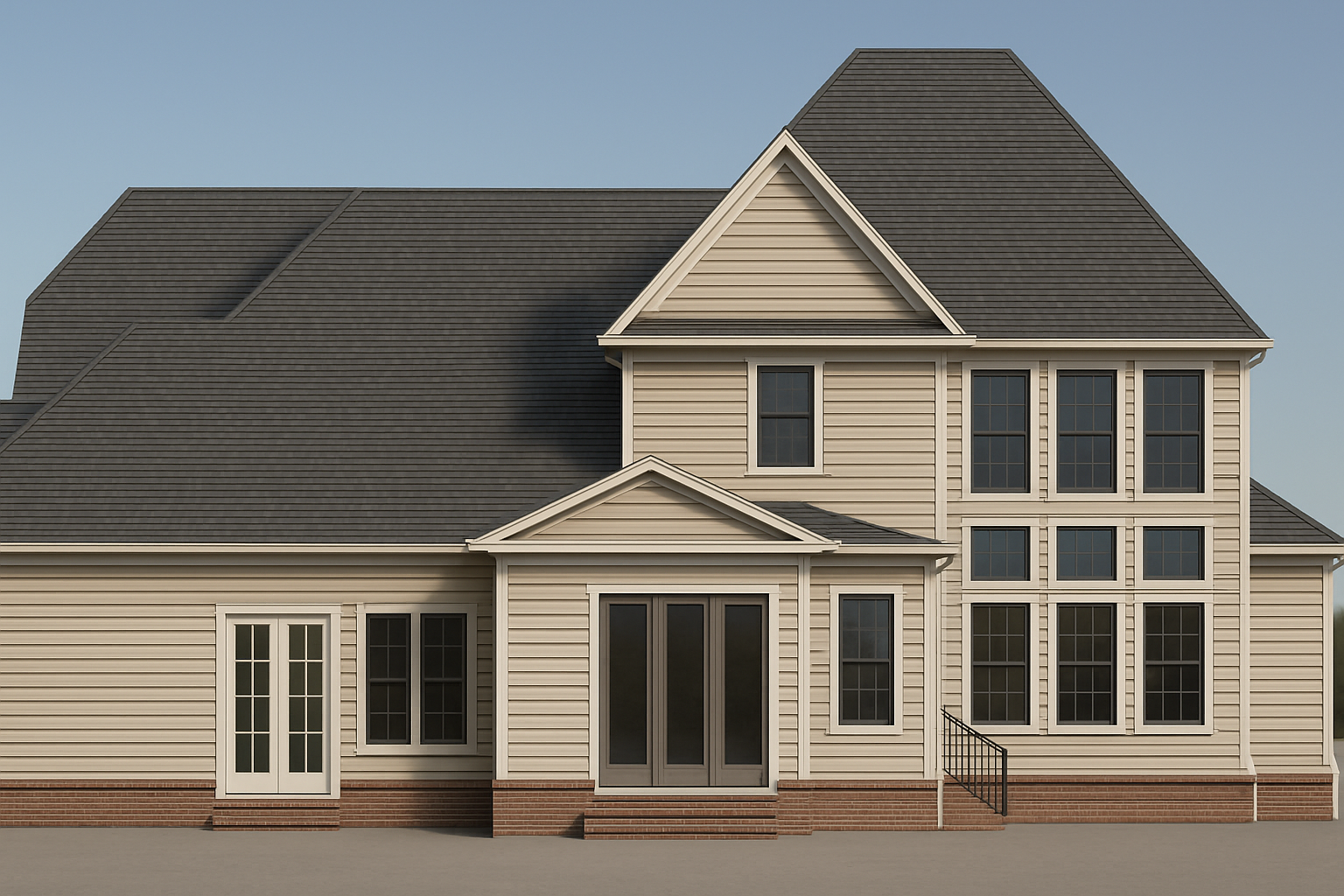 dark blue lap siding with white trim around windows dark brown roof architecture