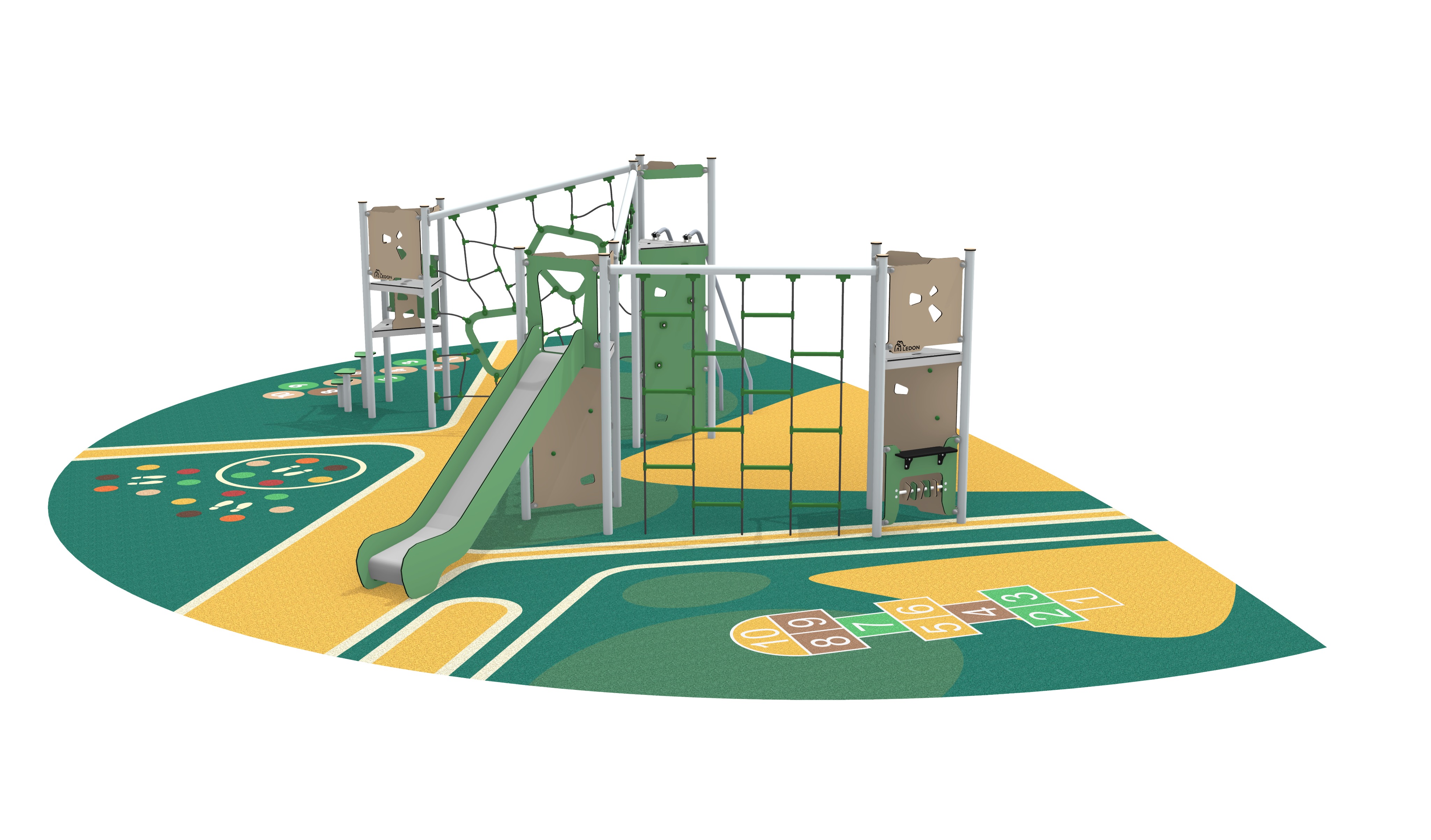 pg render hyper realistic architectural render of a bustling outdoor children s playground area within a luxury private residence suitable for a luxury magazine feature do not add any playground structure or playground flooring other than what is given visual foundation composition the overall scene composition camera angle and surrounding outdoor elements like implied landscaping are inspired by singapore park outdoor environment details the setting is clearly outdoors with lush well maintained landscaping surrounding the playground this includes tasteful trees and shrubbery that frame the scene without obstructing the playground the ground beneath and around the playground should be appropriate for an outdoor play area e g safety surfacing grass do not change the colors and design present in the given play area flooring vibe lighting liveliness the lighting replicates a vibrant day time with warm directional light primarily from the side creating rich highlights only making soft shadows no harsh shadows accepted the scene is exceptionally lively and bustling populated with a greater number of diverse children actively and dynamically playing on and around this specific playground model climbing sliding interacting adults are also present supervising or engaging in relaxed interaction within the well landscaped area the atmosphere is highly energetic happening and refined all materials and textures wood metal safety surfacing foliage building facades are rendered with a 4k uhd level of hyper realism and tactile quality matching the previous luxurious aesthetic output quality the final image should be clean free of watermarks and convey a premium aspirational quality