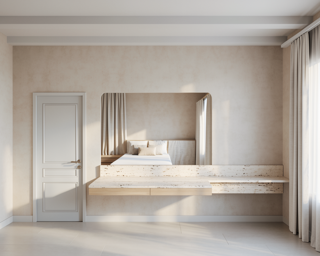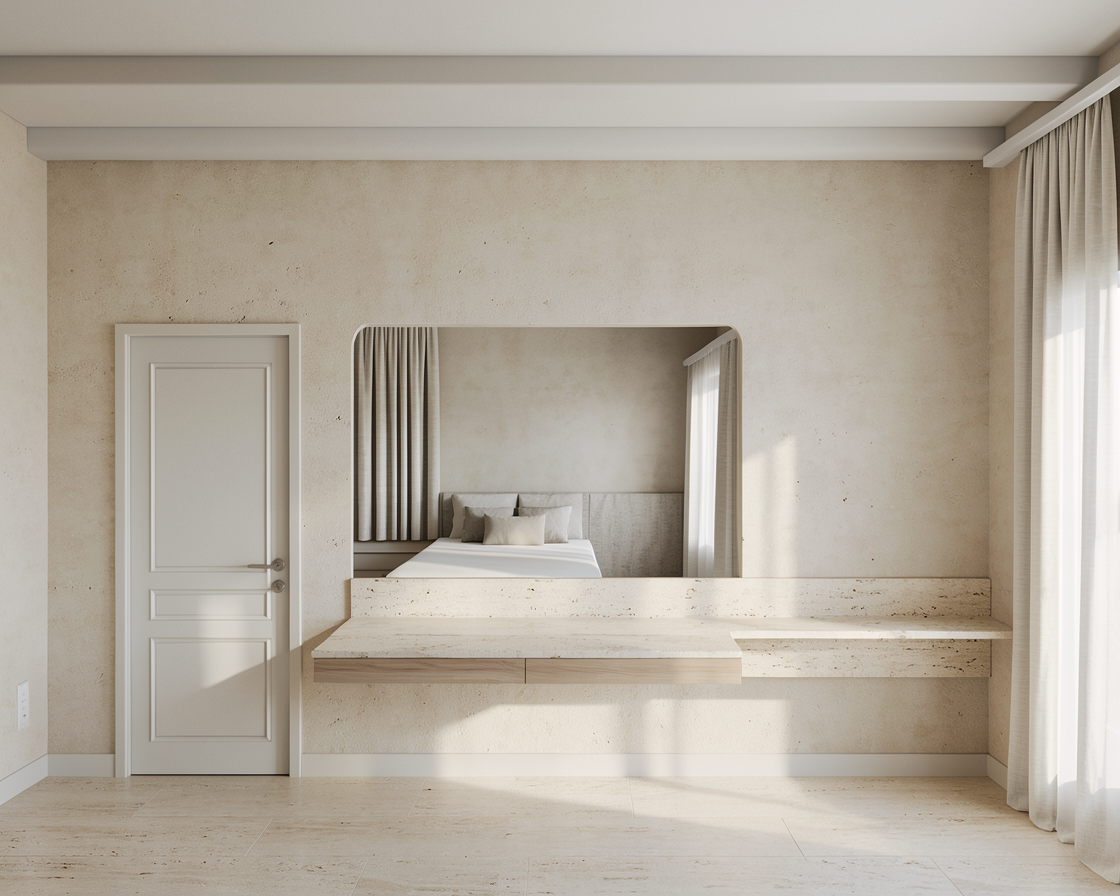 create a realistic and professional render of a room with a calm and atmospheric mood the space is softly illuminated with daylight creating a gentle ambiance with the minimal shadows the lighting should feel balanced enhancing the realism of the materials the fabrics look high quality refined and luxurious ultra realistic render high resolution professional interior design photography style keep the design exactly as it is the walls has a light beige tone like cemento effect light texture travertino details on the sideboard off white linen curtains keep what the mirror reflects exactly how it looks