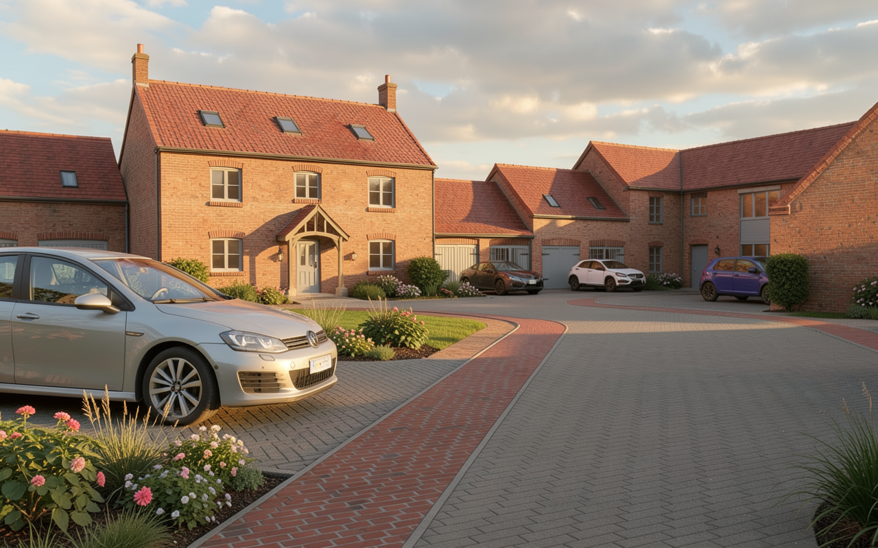 add flanking gravel parking and a landscaped patio in front