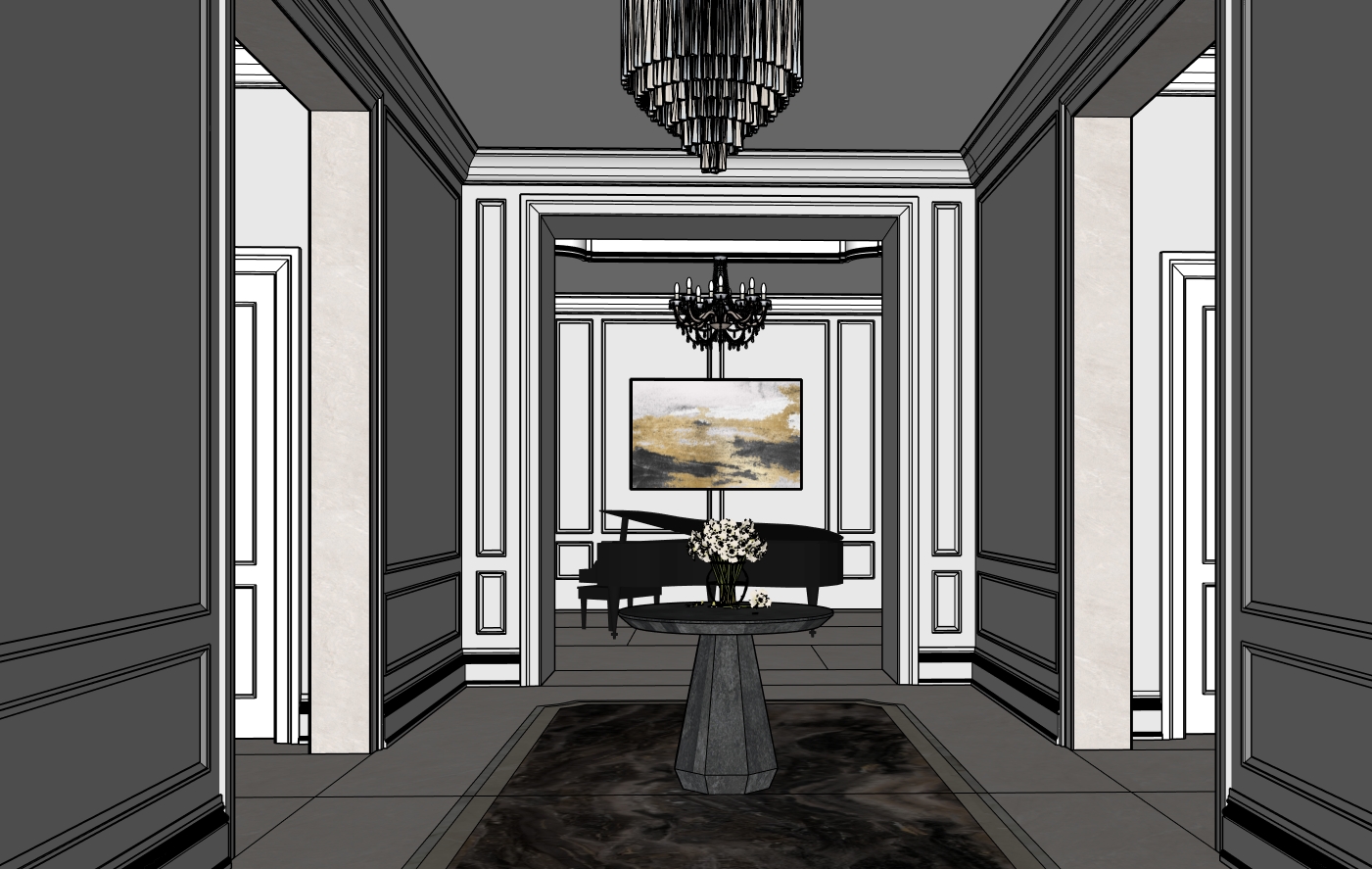 create a highly realistic architectural interior rendering based strictly on the provided reference image absolute fidelity to proportions materials colors lighting furniture and props is required no artistic reinterpretation foyer flooring critical main floor is light cream natural stone matching exactly the tone warmth and brightness of the reference image the central custom made inlay must be bano orobico marble bookmatched from top to bottom along the longitudinal axis the bano orobico texture must be darker and cooler leaning towards charcoal gray and soft black not warm brown or coffee tones veining should be refined and elegant with gray black movement and minimal warm coloration finish is polished but subtle not overly glossy foyer walls moldings the foyer walls must feature wood paneling painted white exactly as shown in the reference image match panel layout rhythm proportions joints depth and orientation precisely wall tone and finish must match the reference image exactly with neutral white balance no yellowing no excessive warmth all trims casings and integrated details in the foyer must be coherent with the wood paneling following the same design language seen in the image all moldings trims casing and wall panel details in the foyer must be the same carved light cream stone material where applicable walls must remain bright and luminous with neutral to slightly cool highlights no heavy shadows piano hall flooring the piano hall floor must use the same light cream stone texture and color as the surrounding foyer floor follow the same floor pattern indicated in the reference image maintaining scale rhythm and alignment piano hall walls moldings walls and moldings in the piano hall must be pure white smooth laminated painted finish white tone should be architectural neutral white with a very subtle cool undertone not blue and not warm ivory lighting ambience very important the ambience must be identical in both the foyer and the piano hall use consistent artificial lighting only throughout the entire space no natural daylight no window light no directional sunlight in the piano lounge lighting must achieve a balanced warm cool neutral temperature soft warmth to preserve the luxury feel subtle cool neutrality to prevent yellow or overly warm tones white balance should be neutral approximately 3500 4000k light distribution must be even and controlled with uniform exposure between spaces avoid cinematic warmth amber casts or overly cool blue tones furniture props preserve all furniture d cor and object placement exactly as in the reference image rendering style ultra photorealistic luxury interior physically accurate materials pbr soft reflections realistic shadows high end architectural photography quality