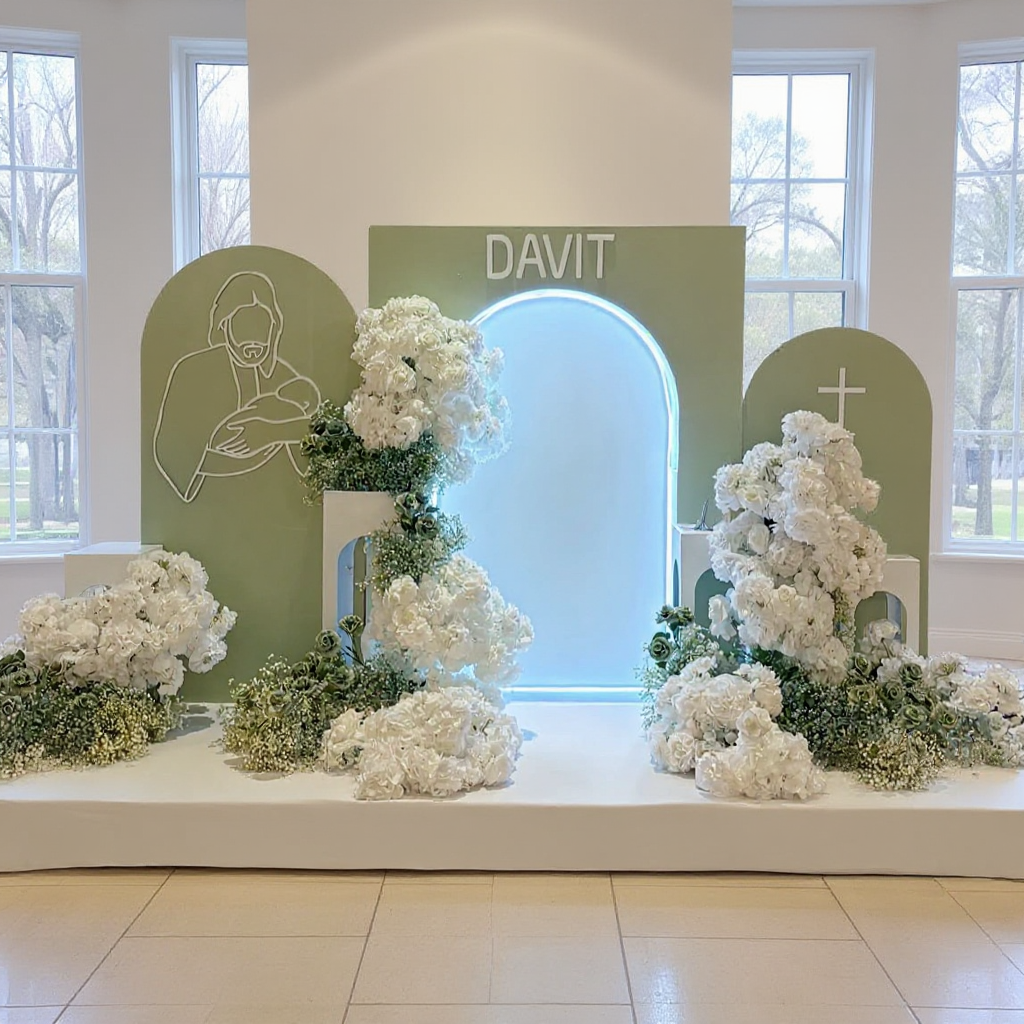 add tiles on the floor add windows no drapes add a white wall as a background add more greenery in the floral arrangement remove candles remove davit writing from the backdrops more greenery