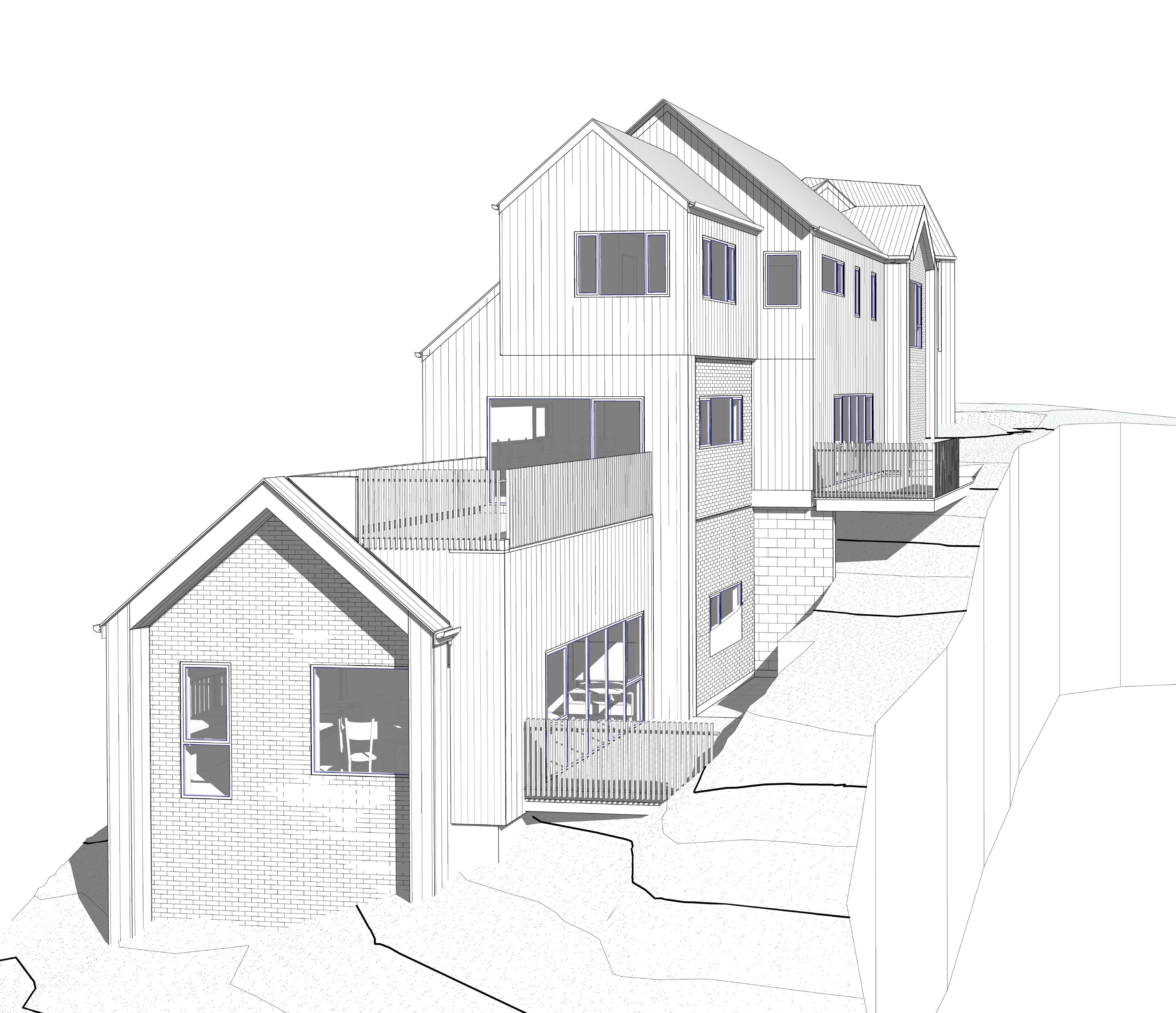 modernist exterior shot render with red white brick to the end detail dark grey metal cladding to the walls black windows and dark grey metal cladding to the roof add a blue sky with clouds add green landscaping and shrubs architecture