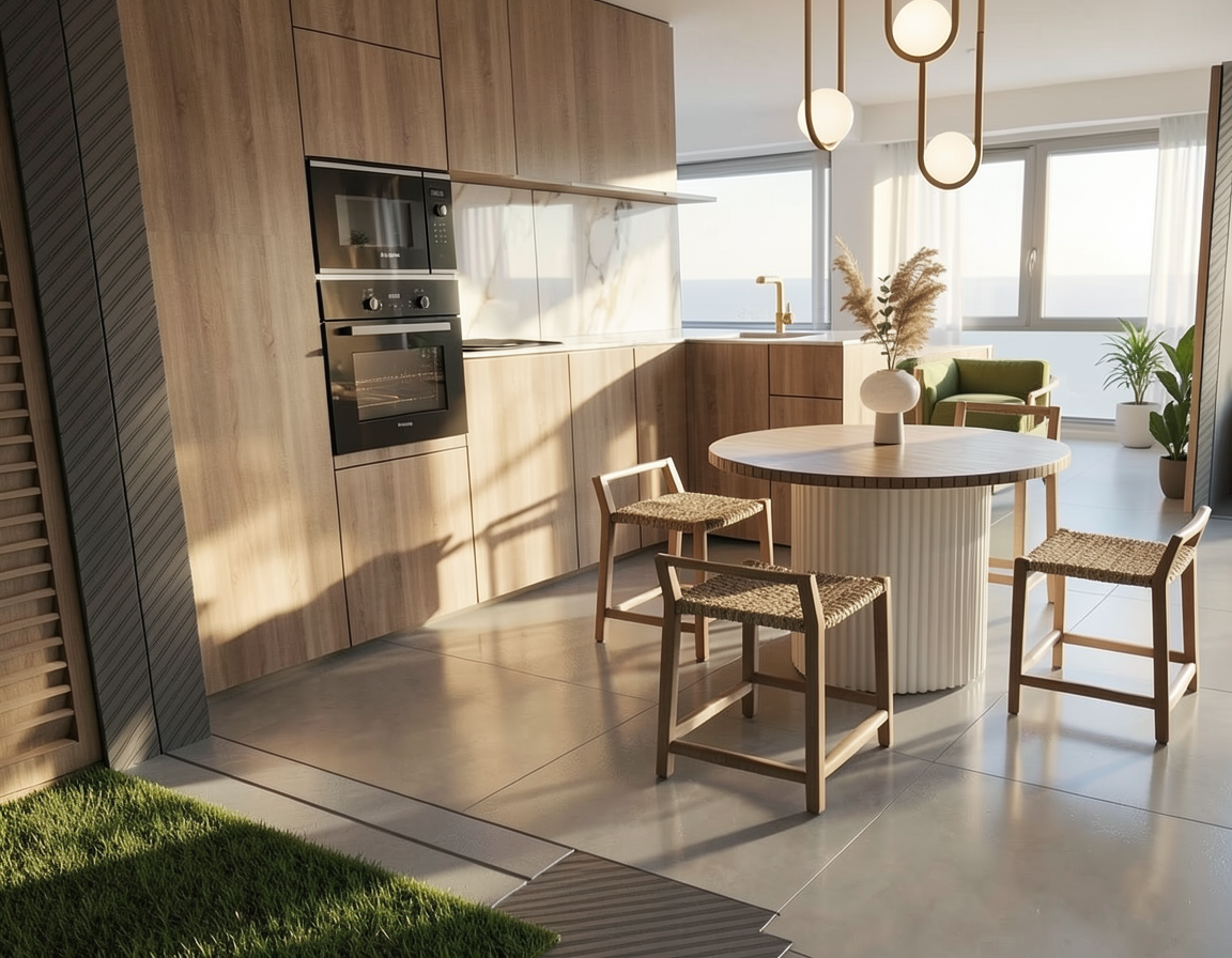 please make the lighting soft even warm and bright keep material as they are shown in the image add city buildings views in the window