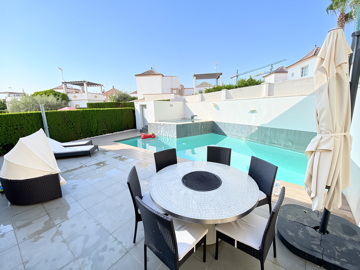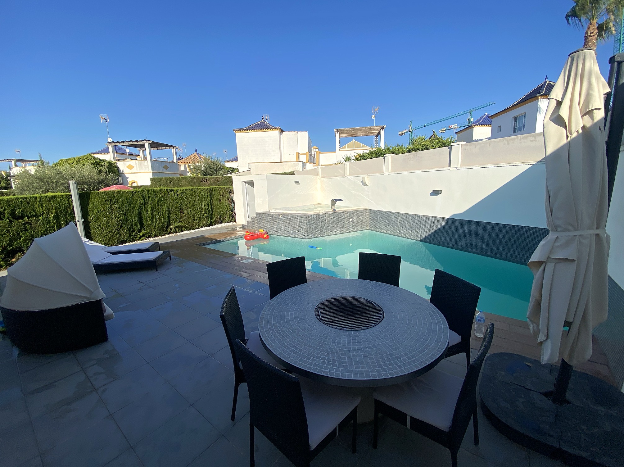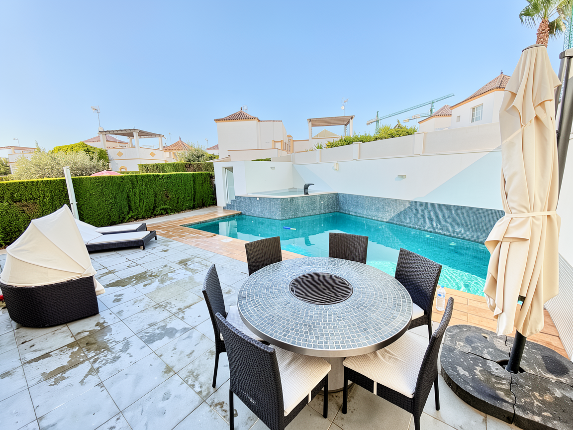 archsynth prompt clean dry terrace no layout changes goal enhance this exact terrace image for a premium holiday rental listing keep all furniture layout and architecture exactly as shown no redesign or additions strict rules do not change any furniture do not move the table do not add or remove chairs do not add plants keep pool shape and structure unchanged maintain original perspective terrace floor important dry the terrace tiles completely remove all wet patches and water stains remove all glossy reflections from the floor tiles must appear matte evenly dry and uniform grey no visible water splashes clean and premium finish pool surfaces enhance pool water clarity clear turquoise remove small floating objects in pool keep realistic water reflections only inside pool hedge trim hedge slightly for a cleaner maintained look keep natural height and density lighting exposure lift dark foreground slightly reduce harsh contrast between sun and shadow keep natural mediterranean daylight no warm sunset effect no dramatic hdr camera correct minor lens distortion straighten vertical lines slightly reduce empty sky area with subtle crop minimal only mood bright clean premium realistic vacation ready negative prompt wet floor water reflections on terrace tiles glossy tile surface water splashes on ground people new furniture plant additions cgi render look over saturation