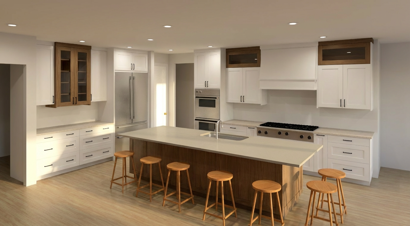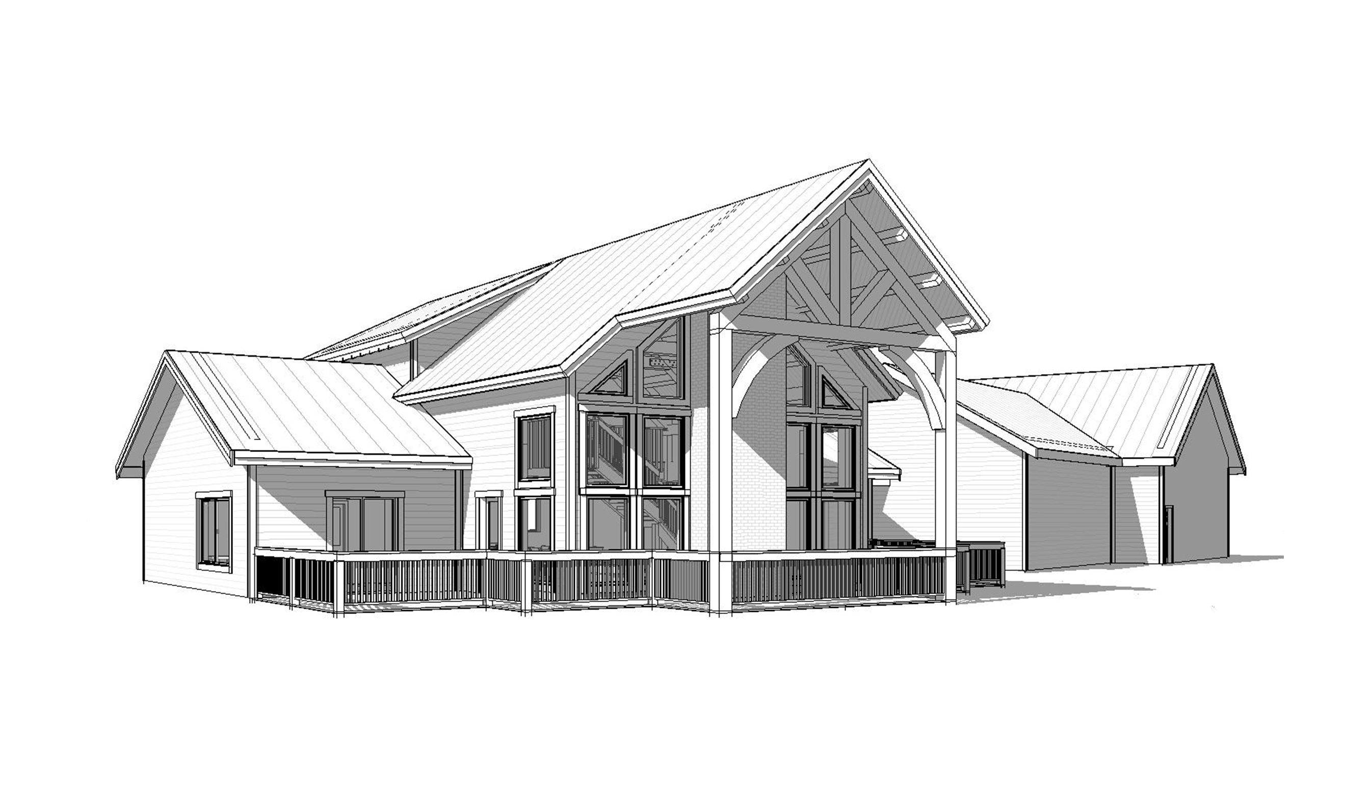 rear view of a clean mountain modern architectural exterior rendered in cinematic vibrant day time lighting with vibrant colorful skies heavy timber architectural style vertical select grade cedar siding with warm wood accents manicured landscaping around structure with hedges and gardens black standing seam metal roof prominent cinematic big forrest of trees in the background high fidelity photorealistic visualization crisp shadow falloff refined facade geometry soft atmospheric depth premium architectural photography mood ultra clean composition and materials black window trim dark roof trim photorealistic render